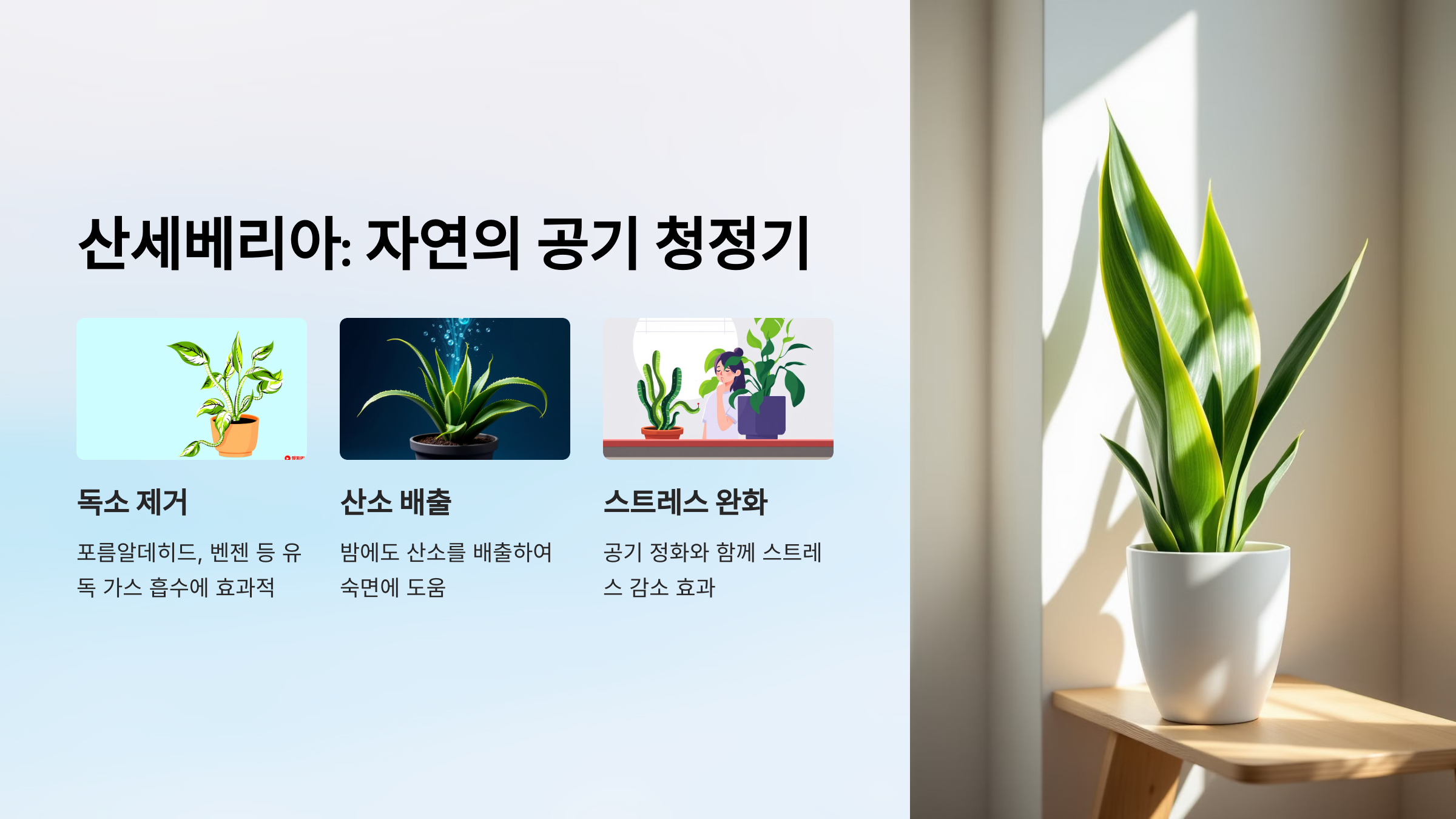 산세베리아는 공기 중의 독소를 제거하는 능력으로 "자연의 공기 청정기"라는 별명을 가지고 있습니다.