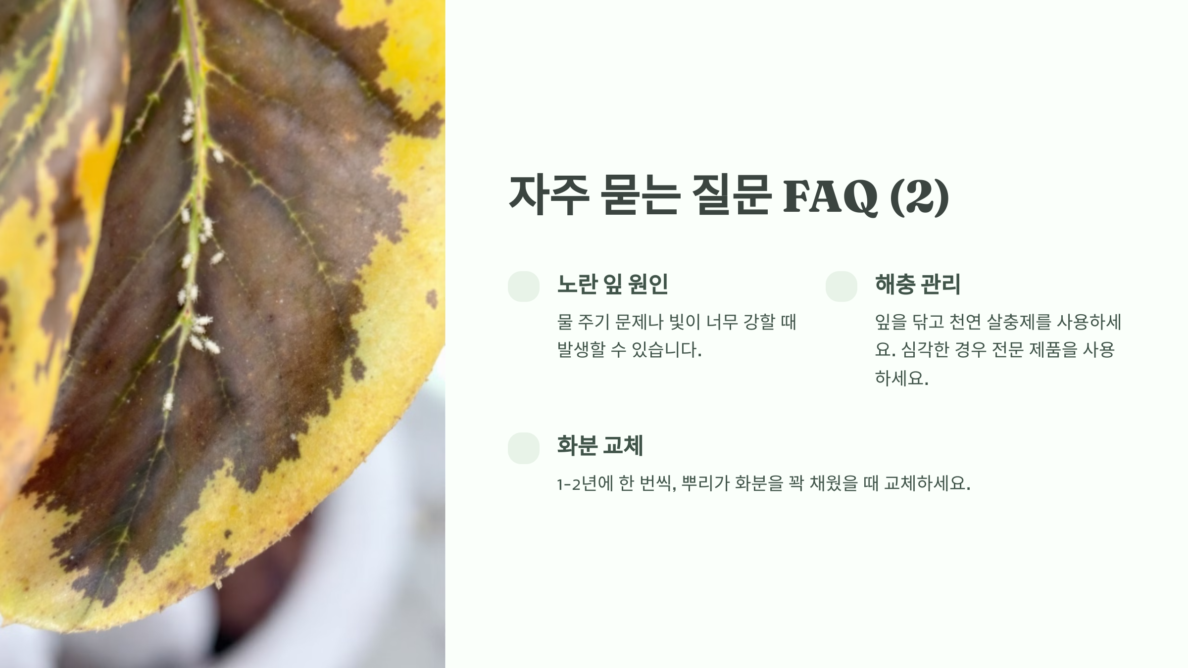 해충이 발생하면 잎을 깨끗이 닦아주고, 필요하다면 천연 살충제를 사용하세요.