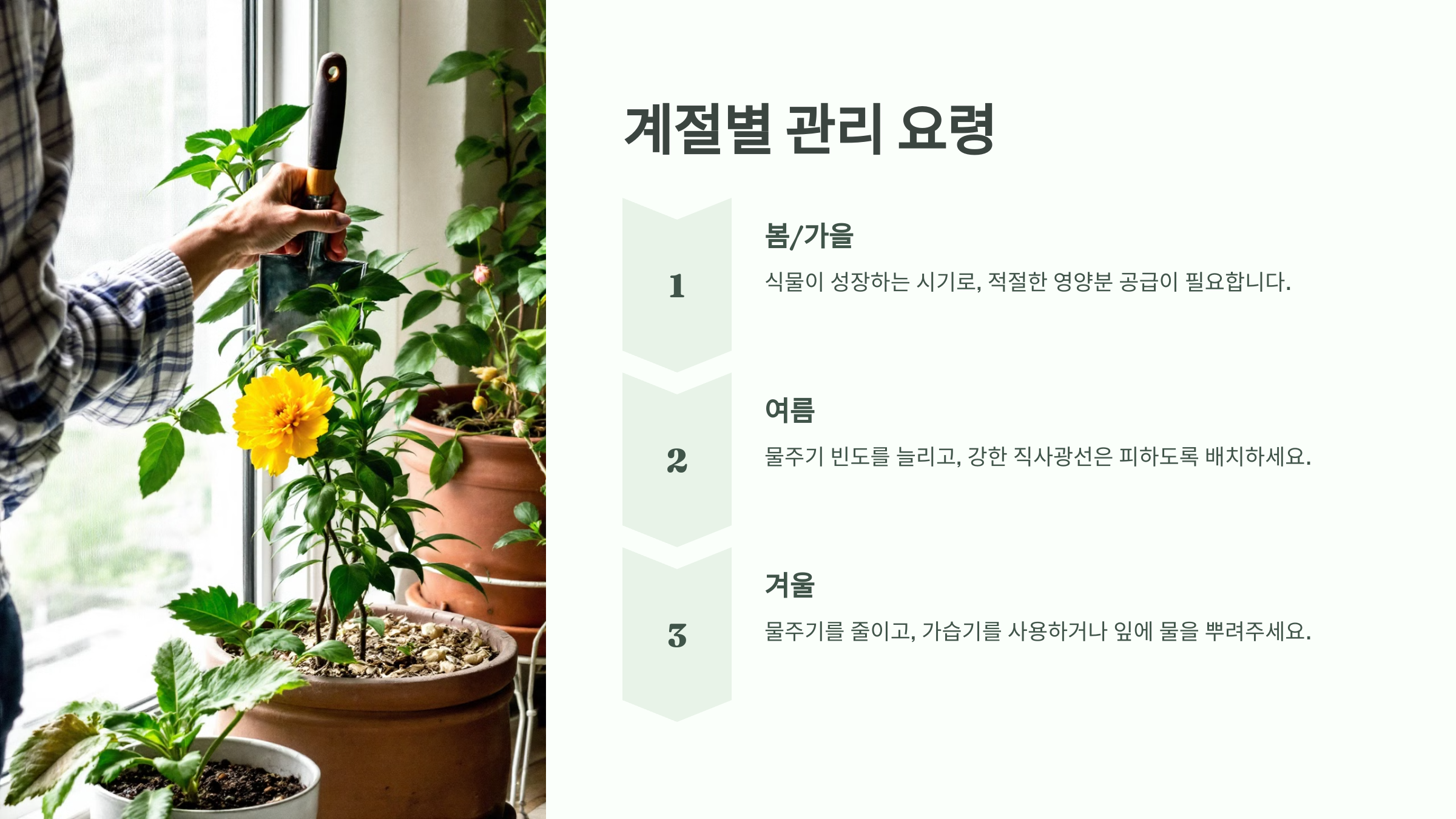 계절에 따라 반려식물의 관리 방법이 달라집니다. 여름에는 물주기 빈도를 늘리고, 겨울에는 줄이는 것이 일반적입니다.
