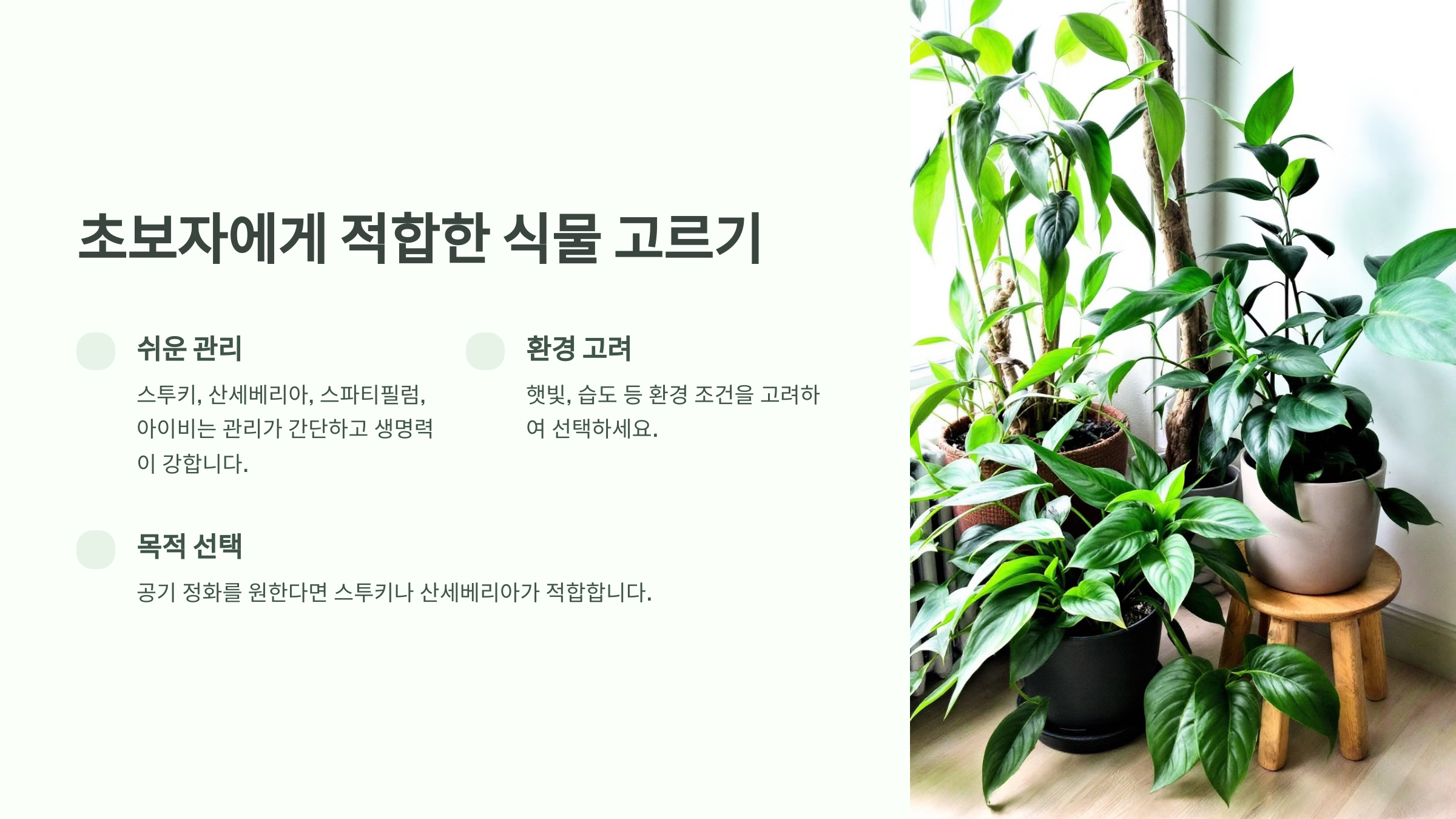 스투키, 산세베리아, 스파티필럼, 아이비 등이 초보자에게 적합한 식물입니다.