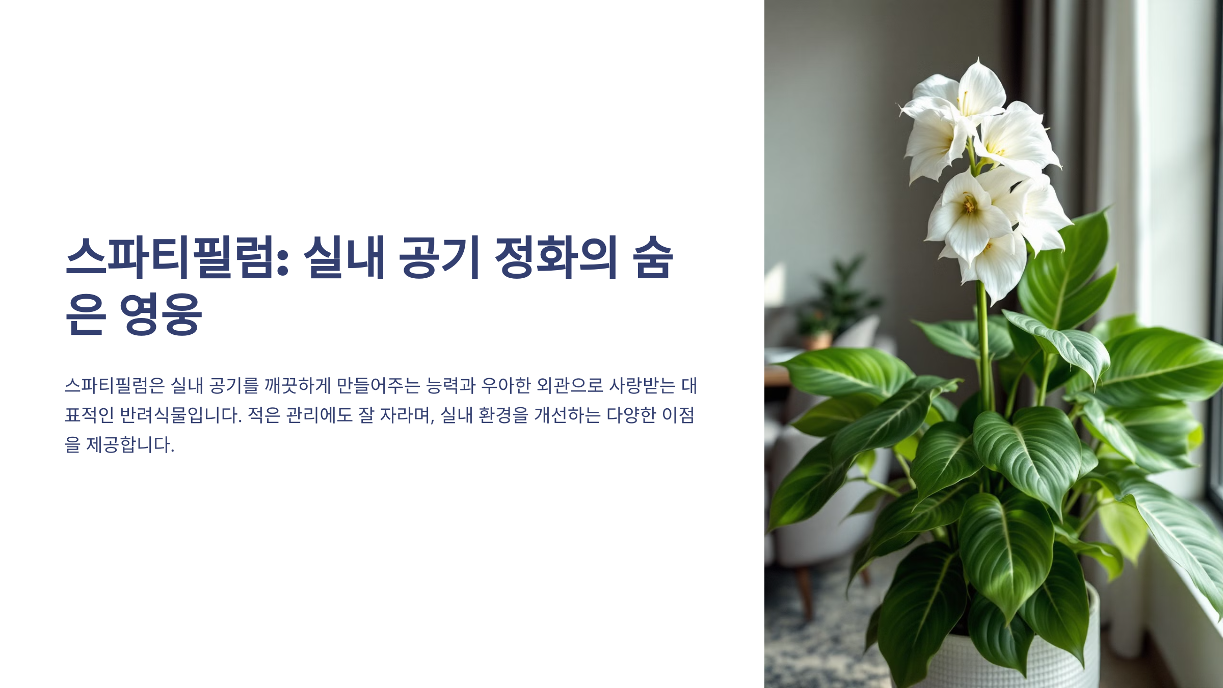 스파티필럼은 실내에서 키우기 좋은 관엽식물로, 흰색의 우아한 꽃과 풍성한 잎이 특징입니다.