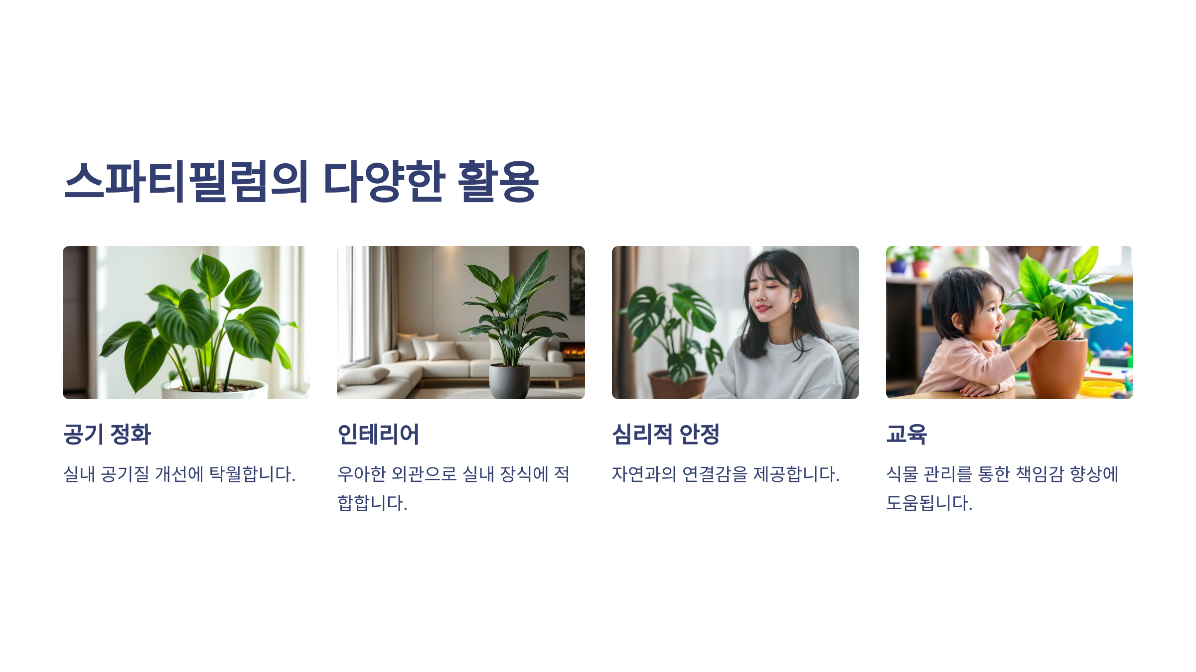 스파티필럼은 실내 공기를 깨끗하게 만들어 호흡기 건강에 도움을 줍니다.
