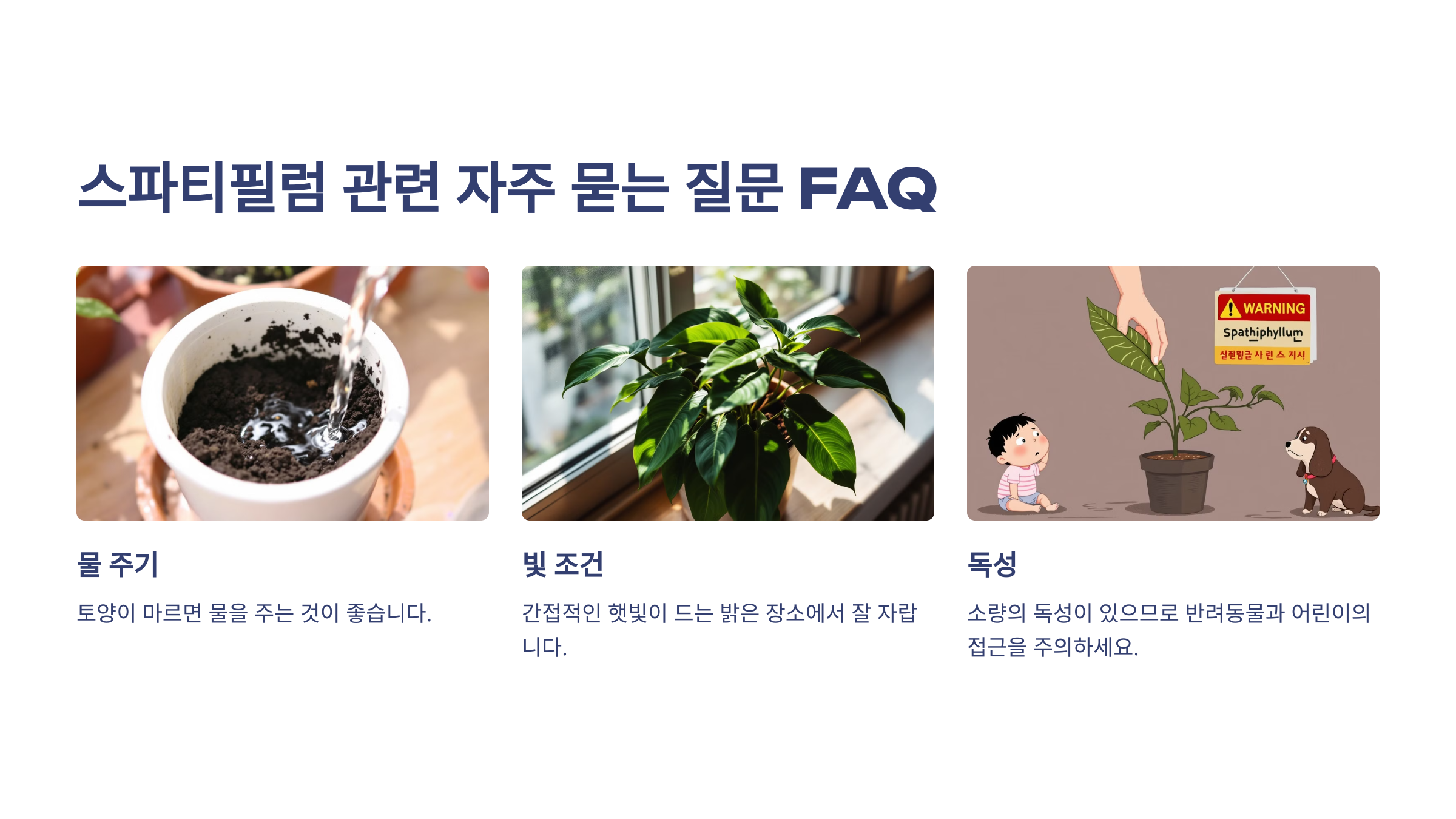 스파티필럼은 소량의 독성을 가지고 있으니 반려동물과 어린이의 접근을 주의하세요.
