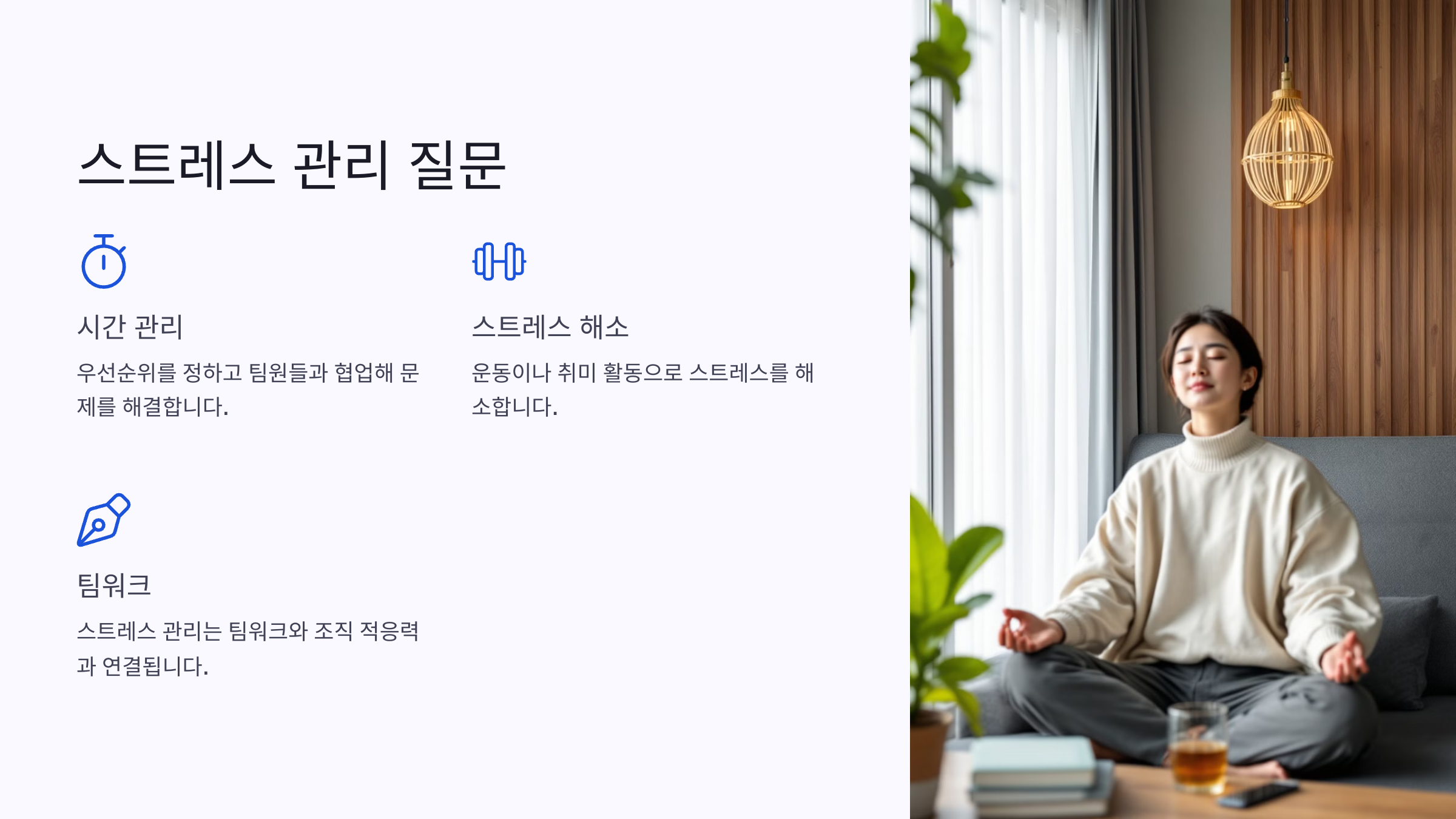 스트레스 관리 질문은 지원자가 어려운 상황에서 어떻게 대처하는지를 평가하기 위한 것입니다.
