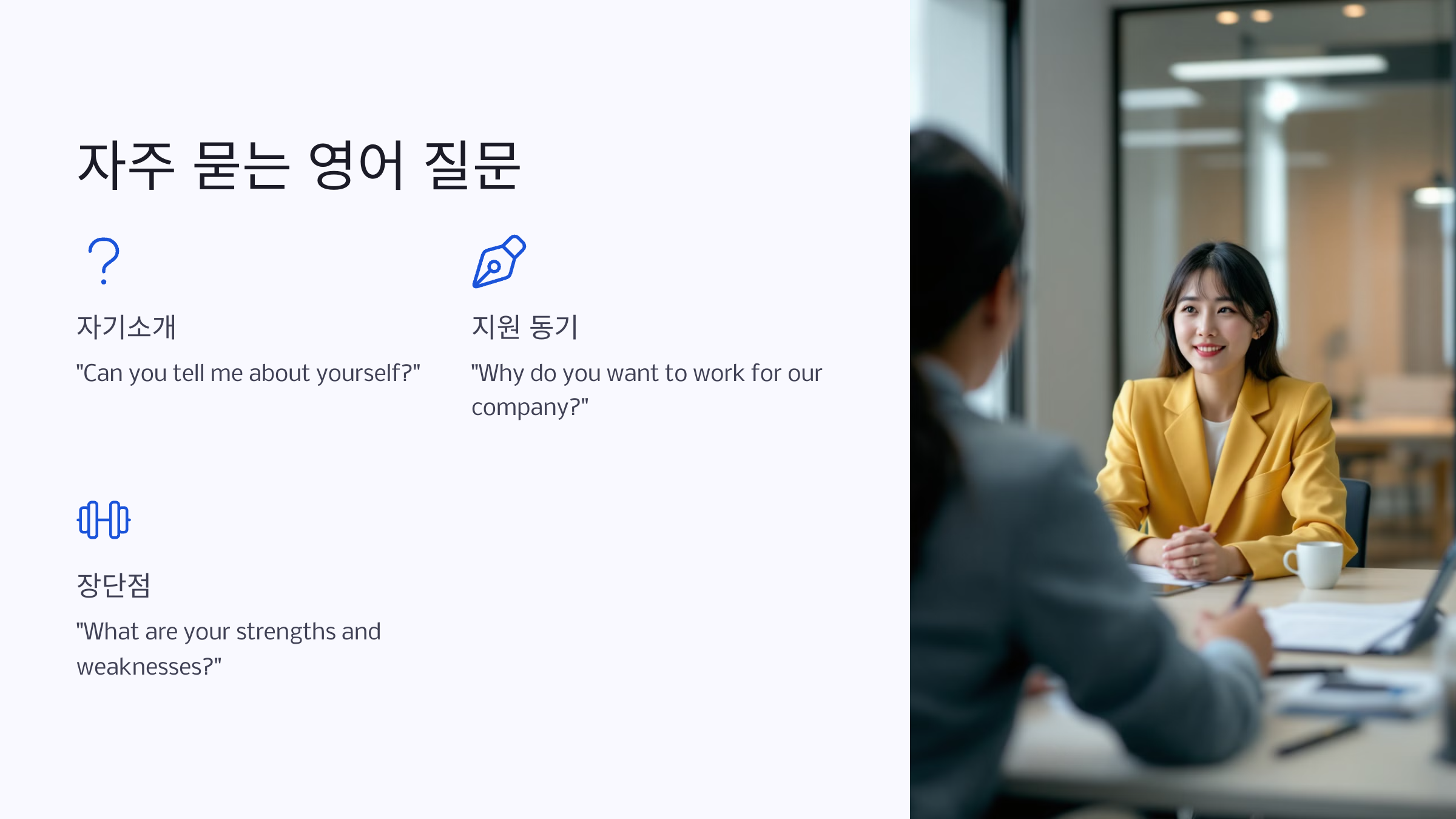 따라서 유창한 발음이나 화려한 어휘보다는 간결하고 명확한 답변을 준비해야 합니다.