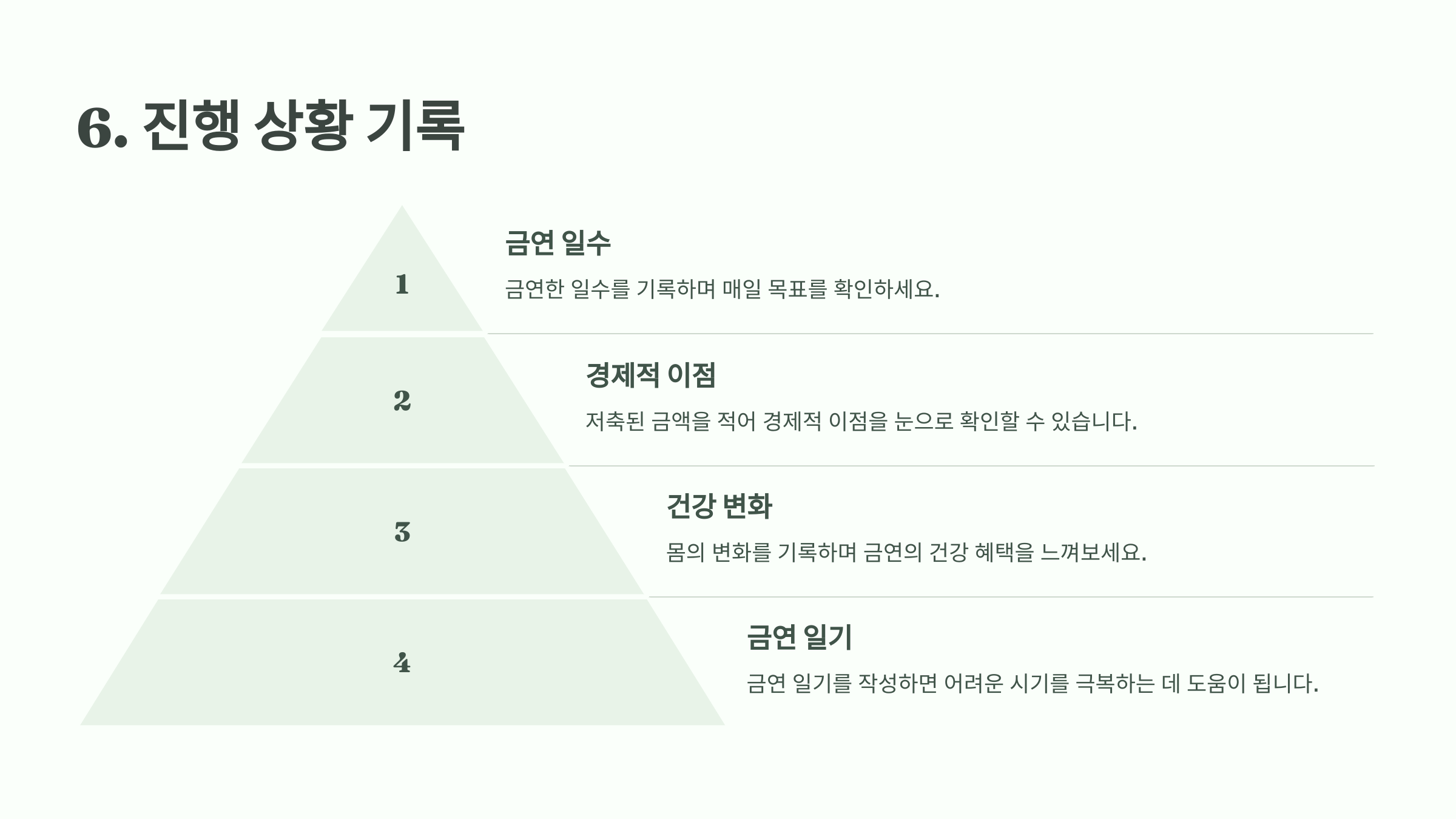 진행 상황을 기록하면 작은 성취를 축하할 수 있고, 금연의 경제적, 건강적 이점을 시각적으로 확인할 수 있어 동기 부여가 됩니다.