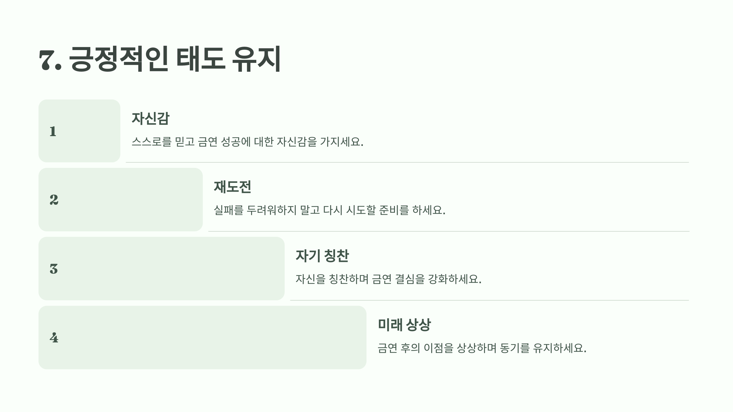 금연 성공의 핵심은 긍정적인 태도를 유지하는 것입니다.