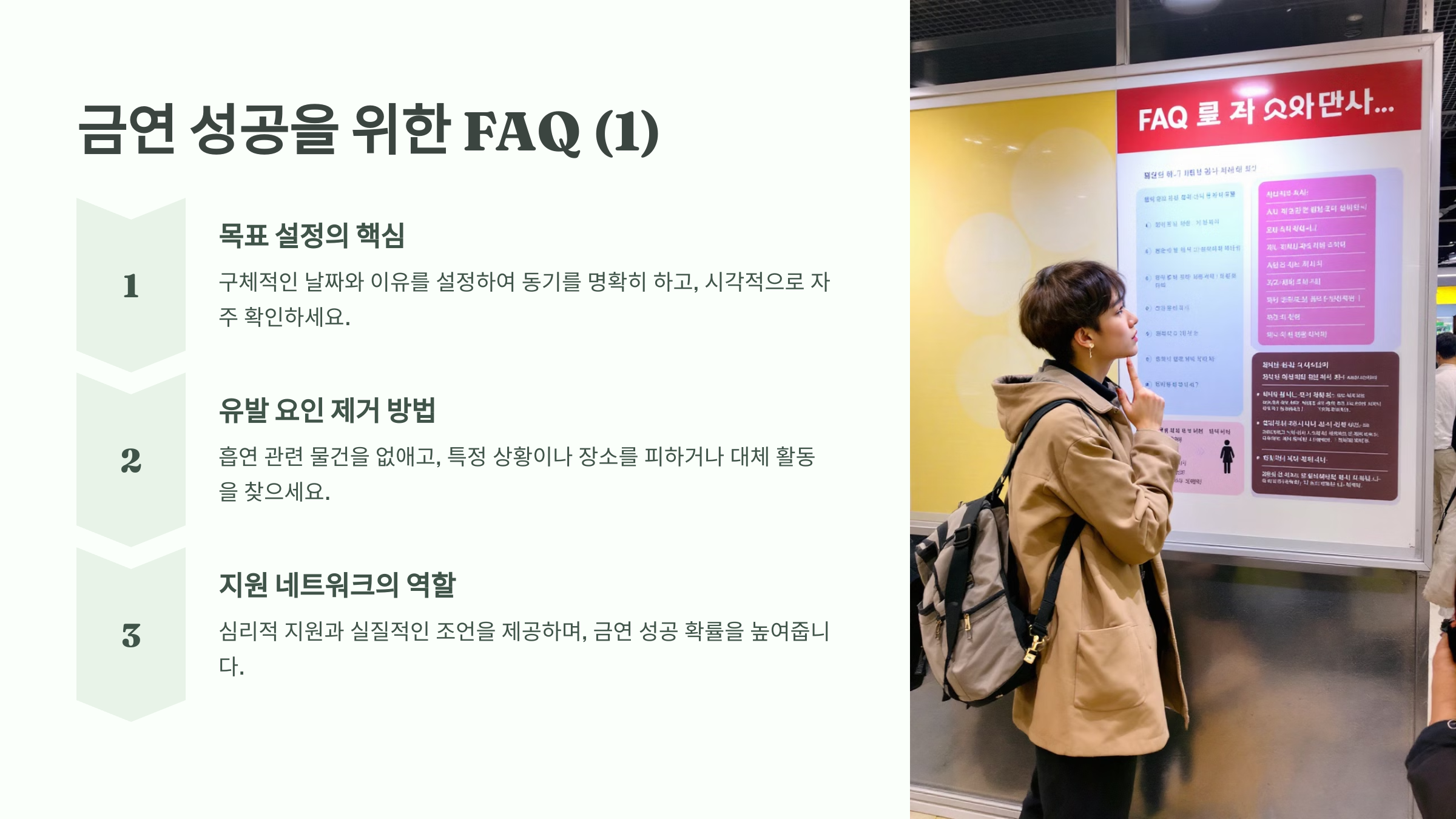 명확한 목표, 지원 네트워크, 긍정적인 태도, 그리고 니코틴 대체 요법 같은 실질적인 전략이 성공에 중요한 요소입니다.
