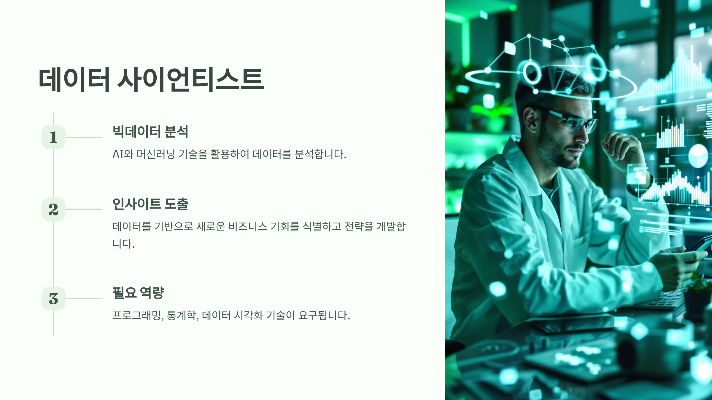 금융, 의료, 제조업 등 다양한 산업에서 데이터 사이언티스트에 대한 수요가 꾸준히 증가하고 있습니다.