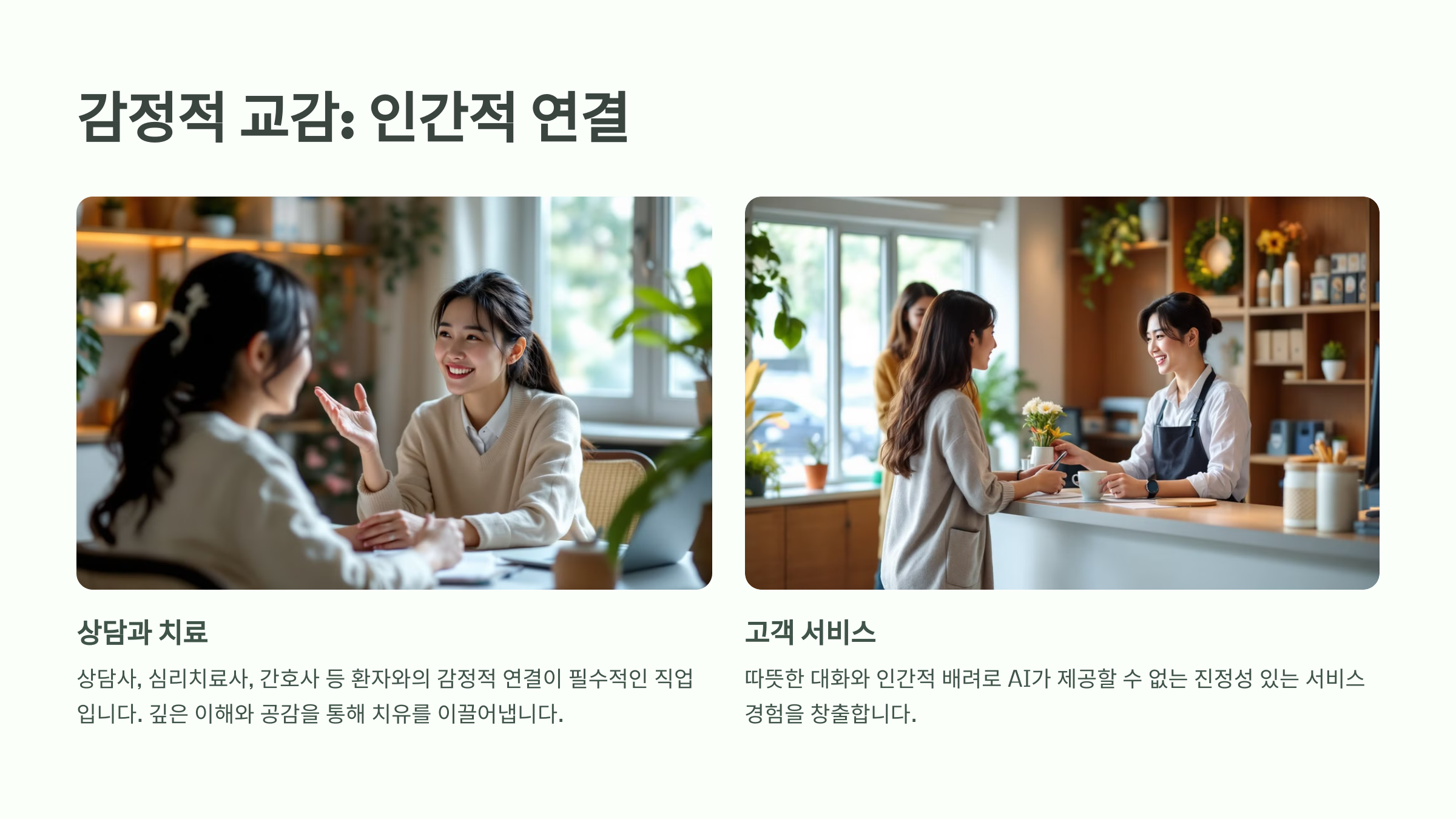 상담사, 심리치료사, 간호사 등은 감정적 교감이 중요한 직업입니다.