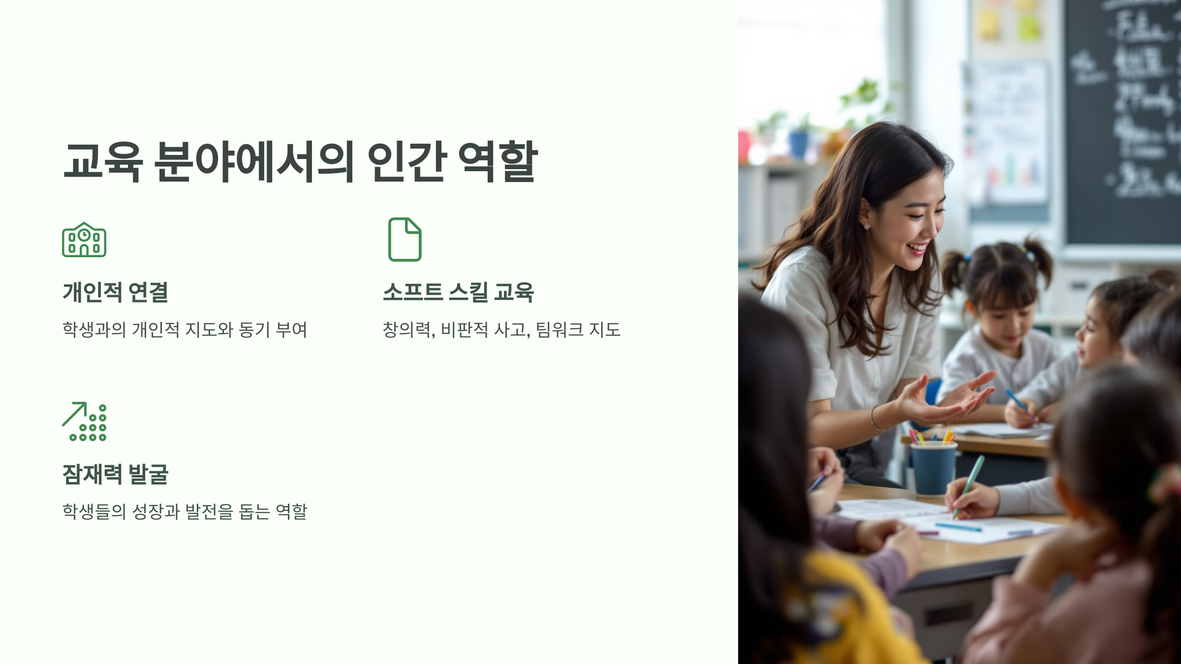 학생과의 개인적 연결과 지도는 인간 교사만이 제공할 수 있는 독특한 가치입니다.