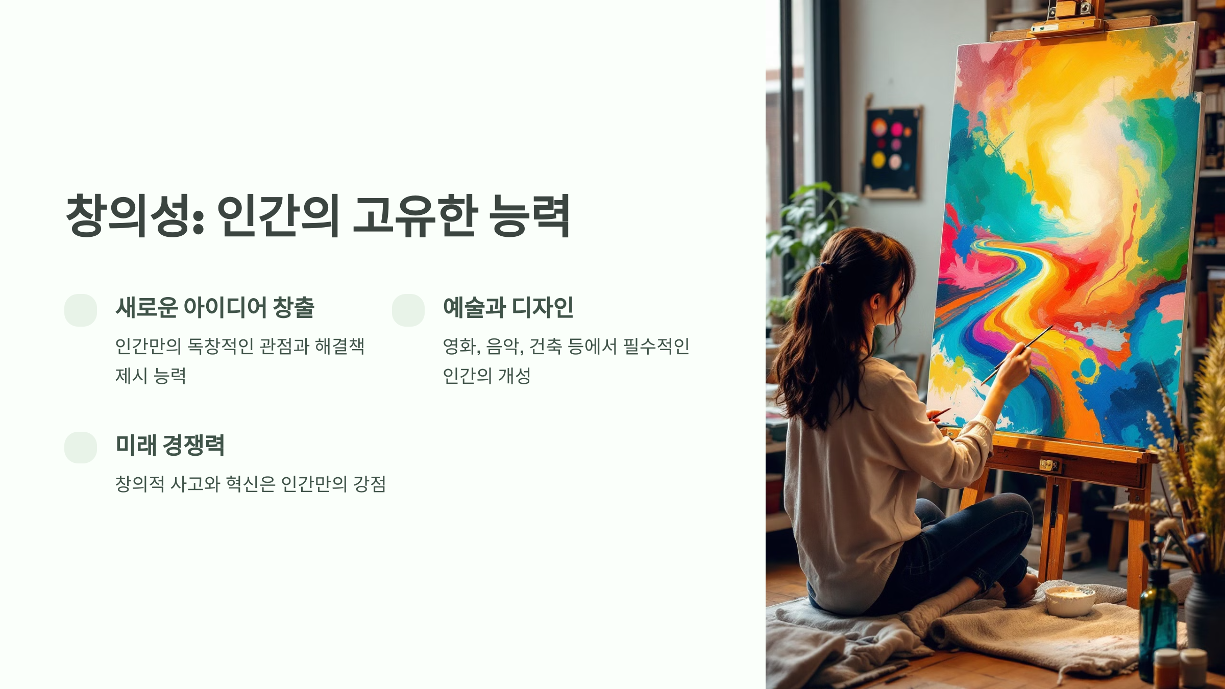 예술, 디자인, 문학 등 창의적 활동에서 인간의 역할은 여전히 중요한 가치를 지니고 있습니다.