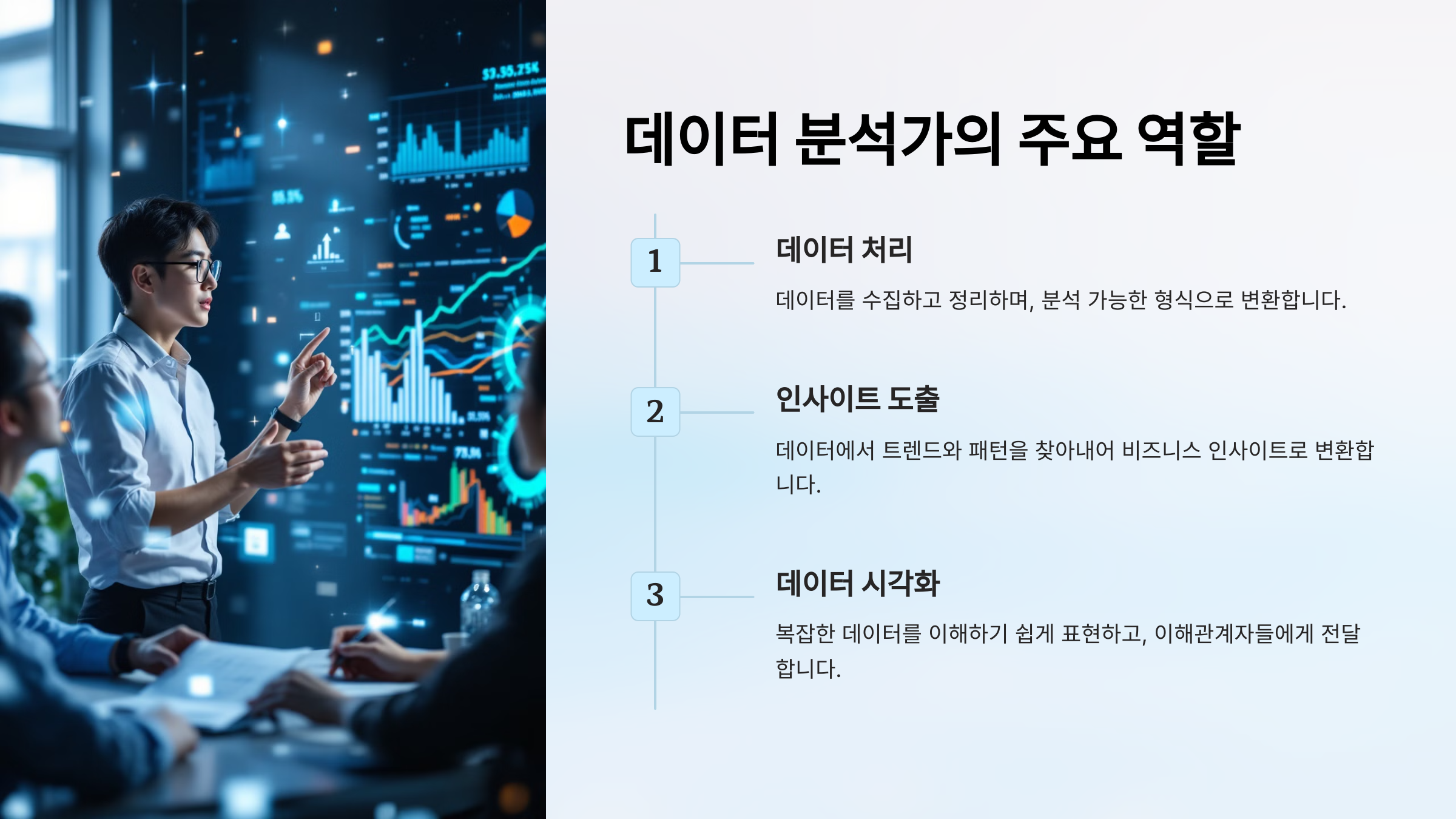 데이터 분석가는 데이터에서 트렌드와 패턴을 찾아내어 이를 비즈니스 인사이트로 변환합니다.
