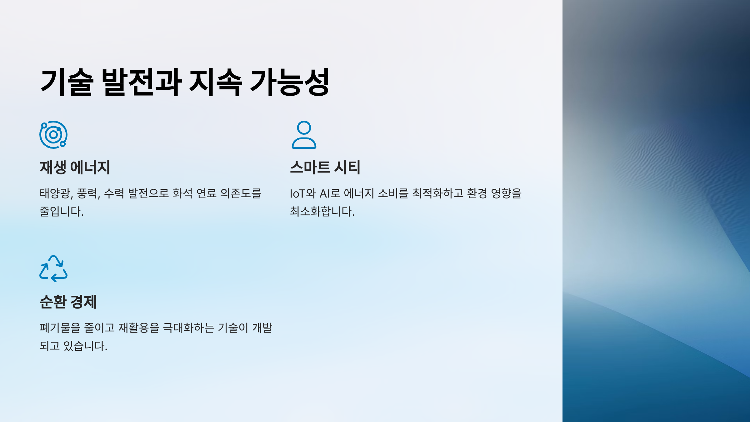 기술은 재생 에너지, 스마트 시티, 순환 경제 등을 통해 지속 가능성을 실현하는 데 중요한 역할을 합니다.