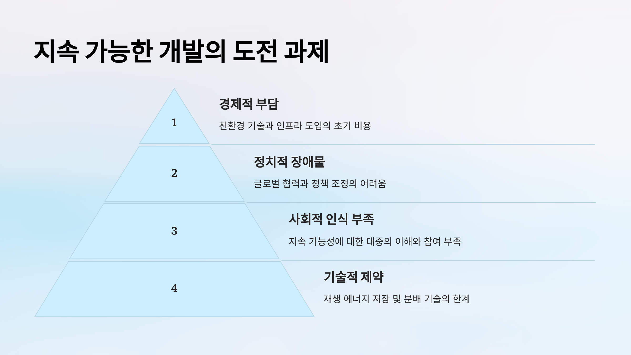 지속 가능한 개발을 실현하기 위해서는 여러 도전 과제를 해결해야 합니다.