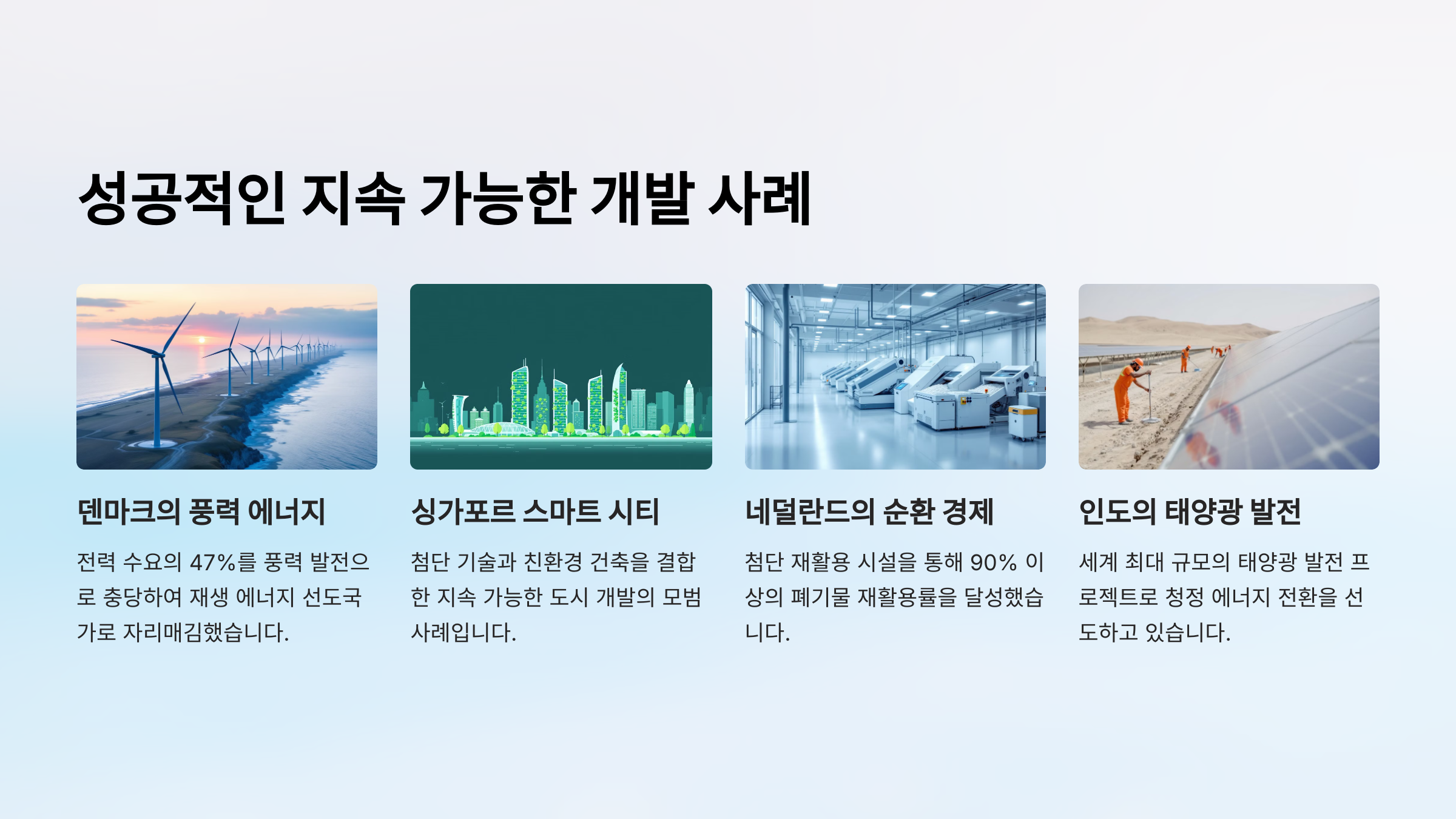 이러한 사례는 기술과 정책, 사회적 참여가 결합되어 지속 가능성을 이루는 데 중요한 역할을 한다는 것을 보여줍니다.