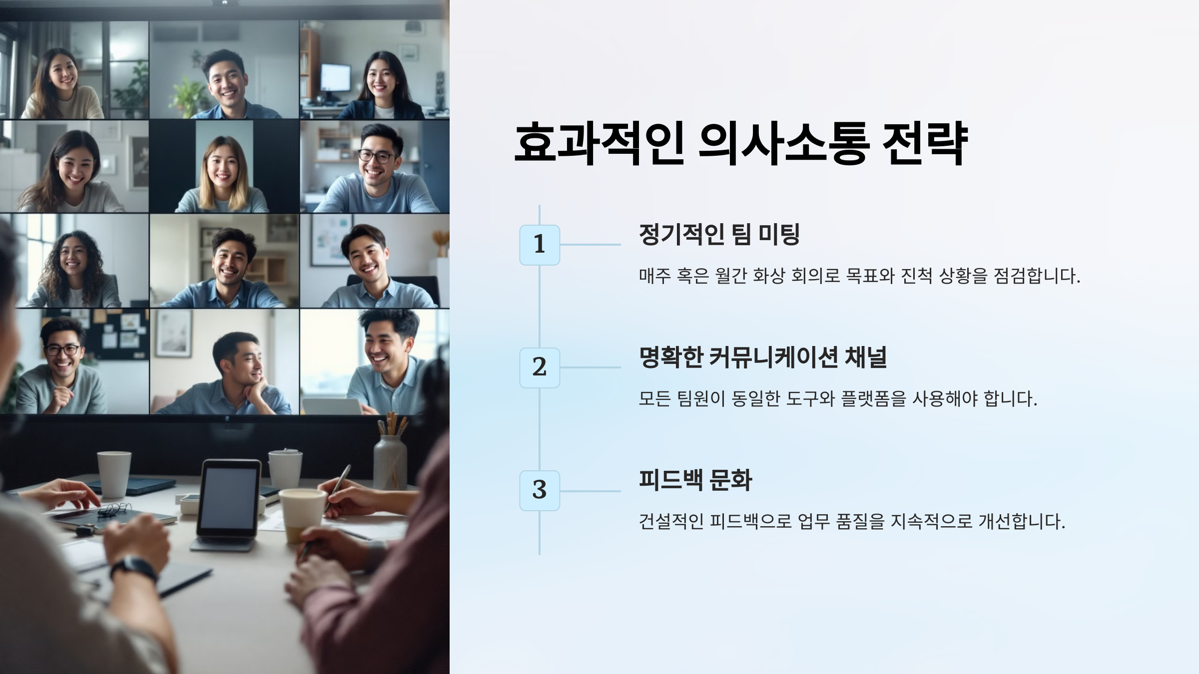 이러한 전략은 원격 및 하이브리드 근무 환경에서도 높은 생산성을 유지하는 데 도움을 줍니다.