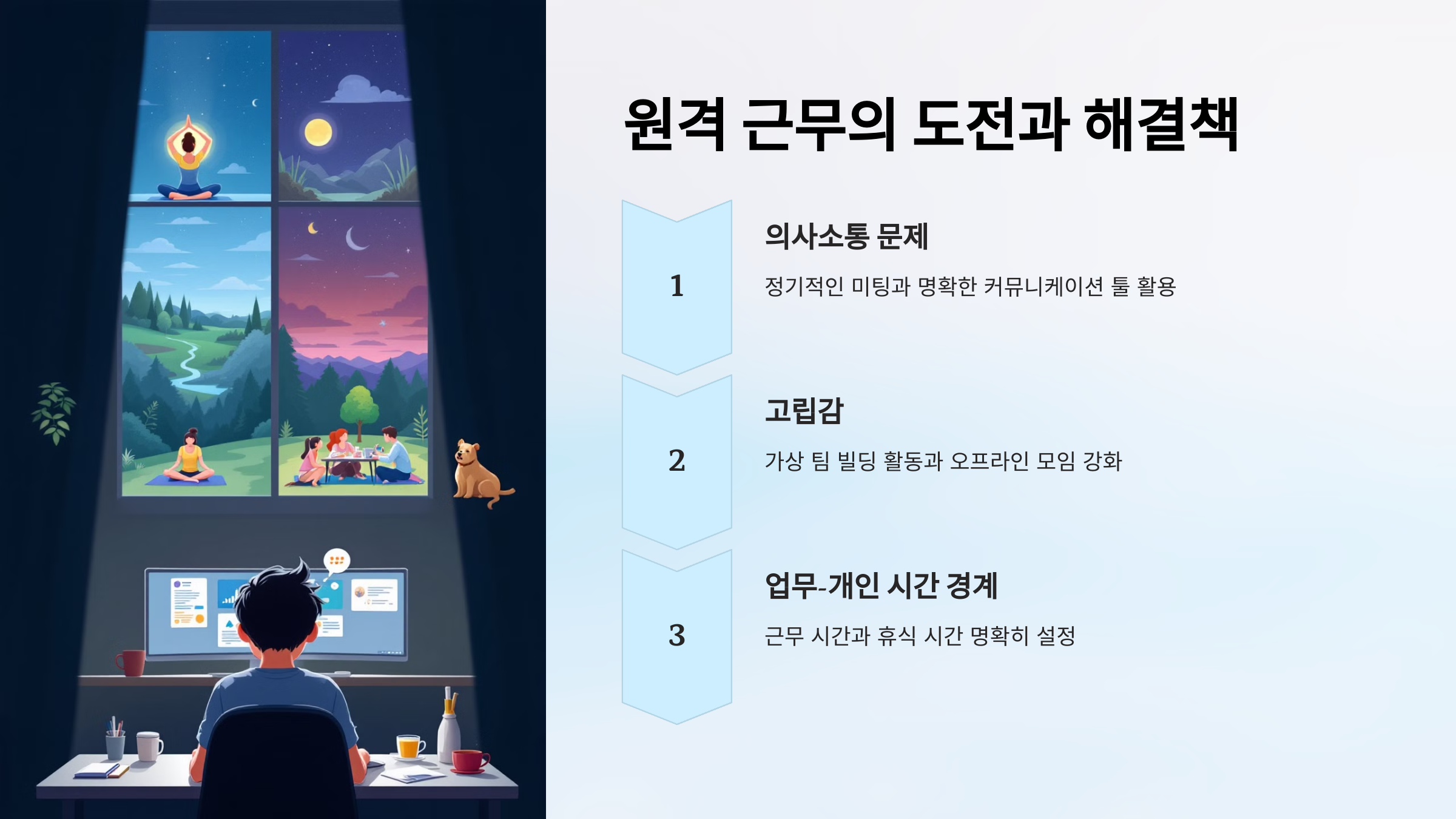 2. 고립감: 가상 팀 빌딩 활동과 오프라인 모임을 통해 팀원 간 연결을 강화합니다.