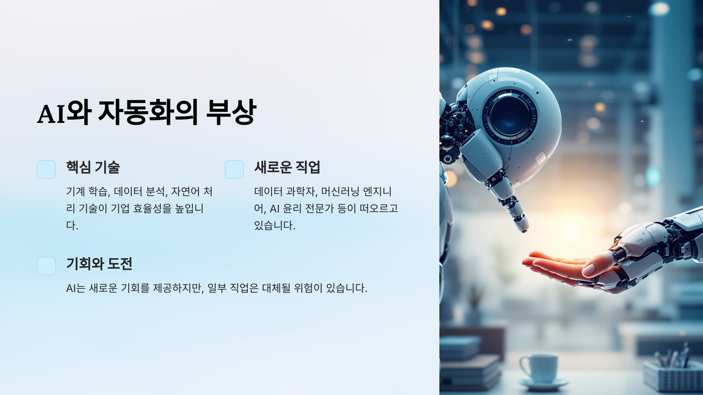 결과적으로, AI와 자동화는 긍정적인 변화와 도전을 동시에 제공하며, 취업 시장에 큰 영향을 미칩니다.