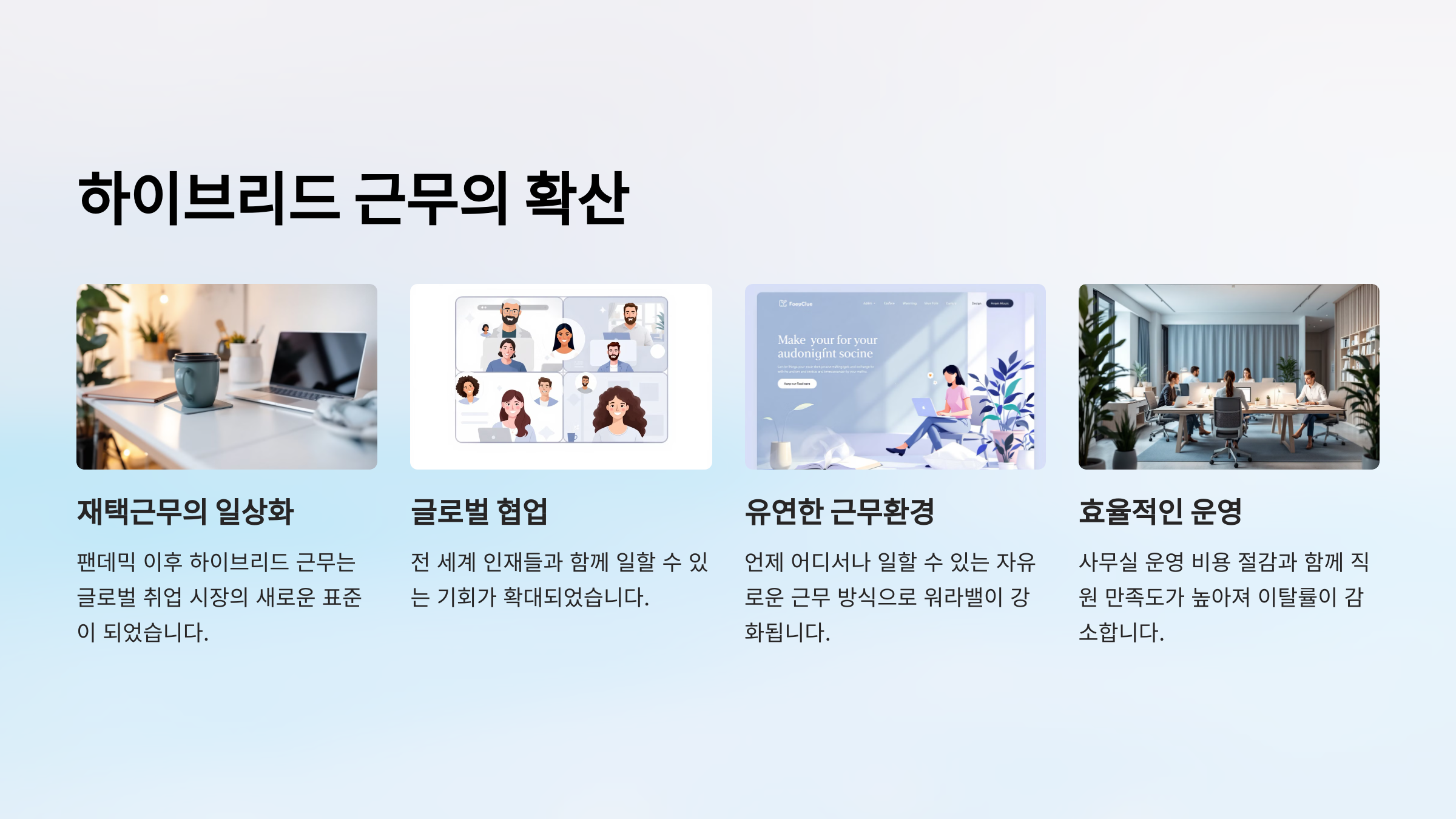 프리랜서와 계약직 근무도 증가하며, 새로운 형태의 협업 방식이 등장하고 있습니다.
