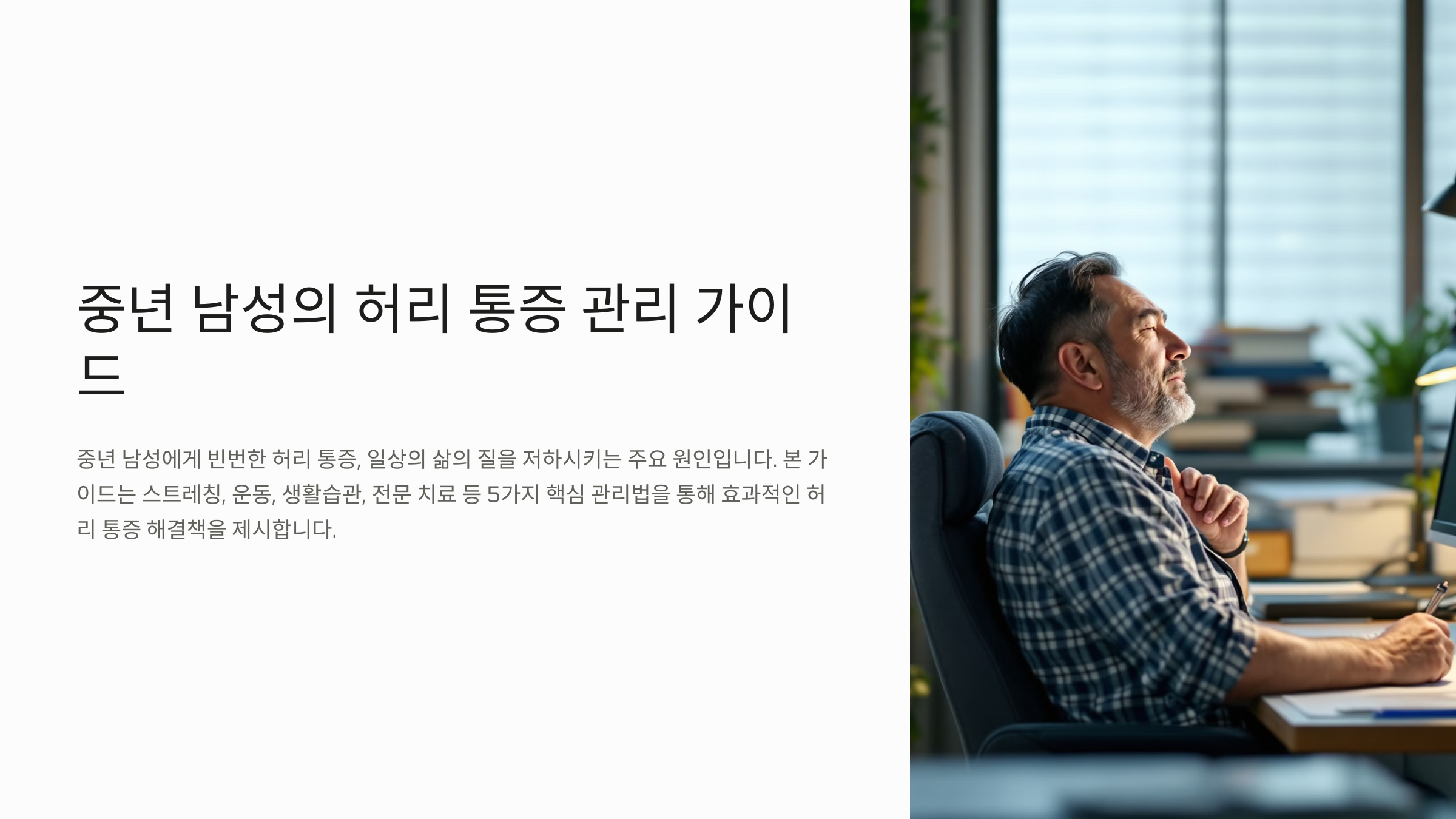 허리 통증은 중년 남성들에게 흔히 발생하는 문제 중 하나로, 일상생활의 불편함을 초래할 수 있습니다. 올바른 치료법을 통해 증상을 완화하고 허리 건강을 회복하는 것이 중요합니다. 본 글에서는 허리 통증의 주요 원인부터 효과적인 스트레칭, 운동, 생활습관 개선 및 전문 의료 치료에 이르기까지 총 5가지 방법을 체계적으로 정리했습니다.