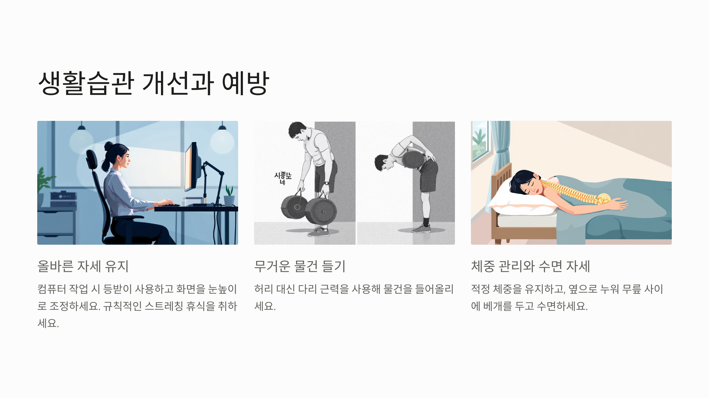허리 통증을 예방하고 관리하기 위해 생활습관 개선이 필수적입니다. 잘못된 자세를 바로잡는 것이 첫걸음입니다.