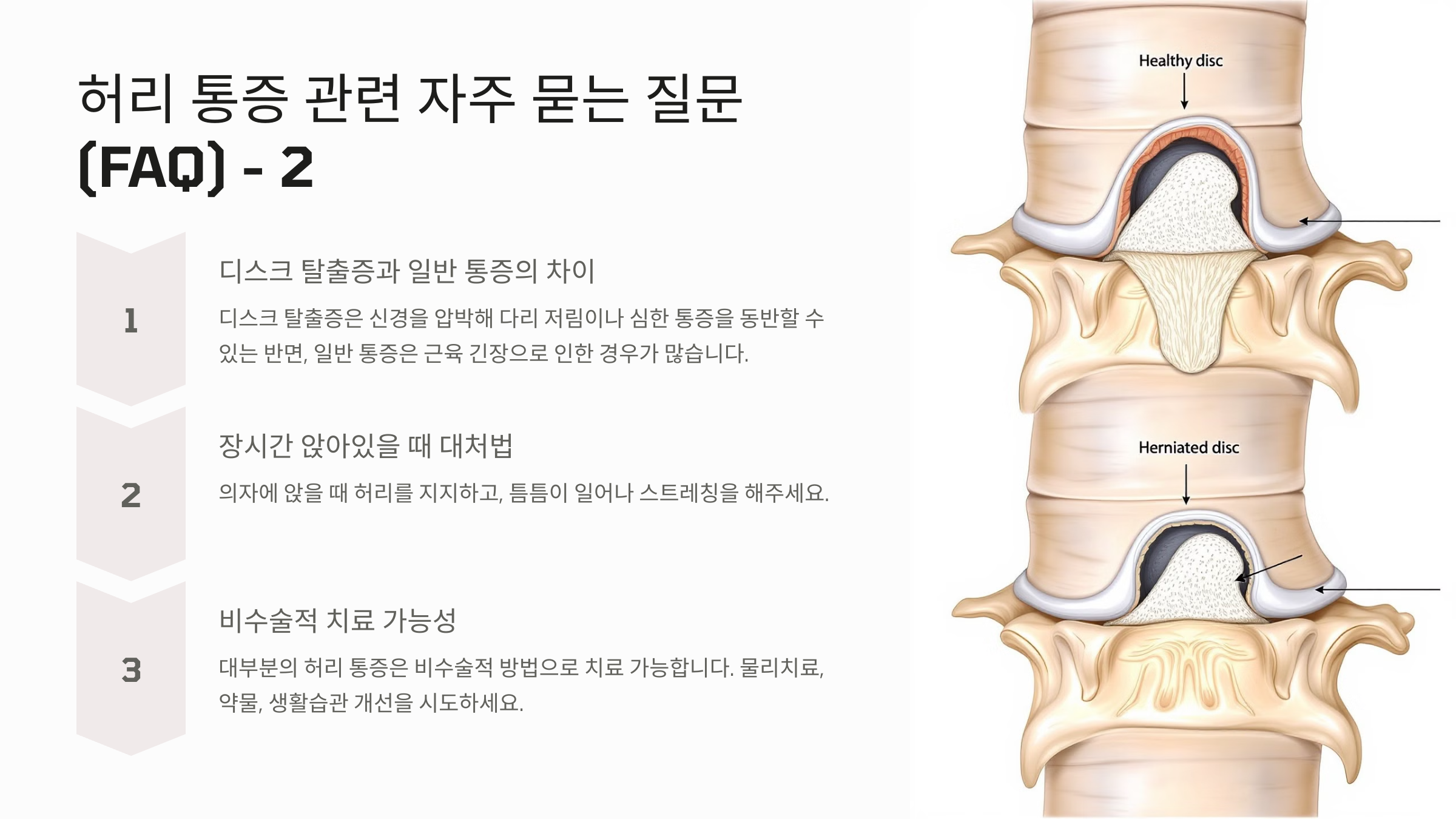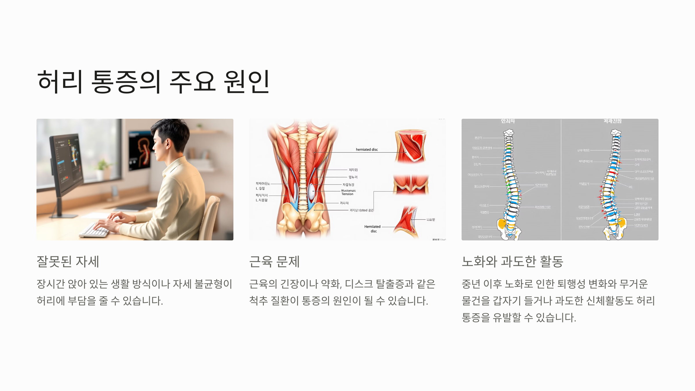 또한, 근육의 긴장이나 약화, 디스크 탈출증과 같은 척추 질환이 통증의 원인이 될 수 있습니다.