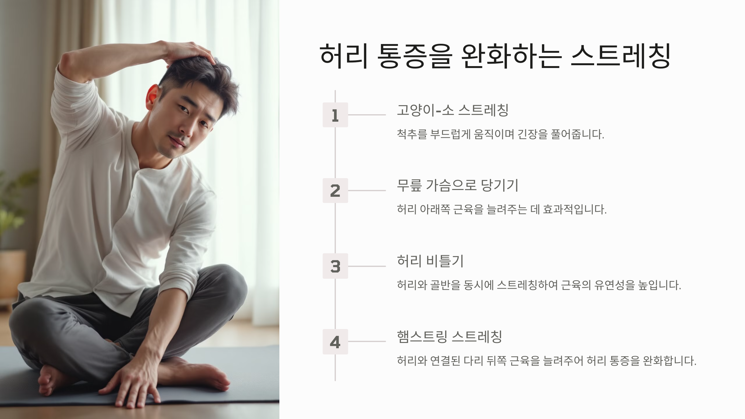 스트레칭은 허리 통증 완화에 매우 효과적인 방법 중 하나입니다. 특히 허리 근육과 척추 주위의 근육을 늘려주는 동작이 중요합니다.