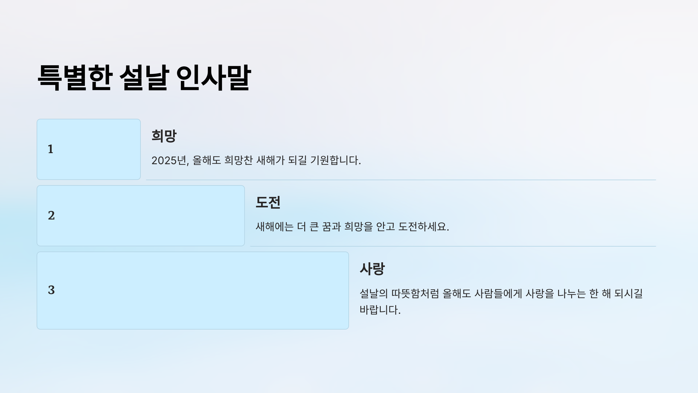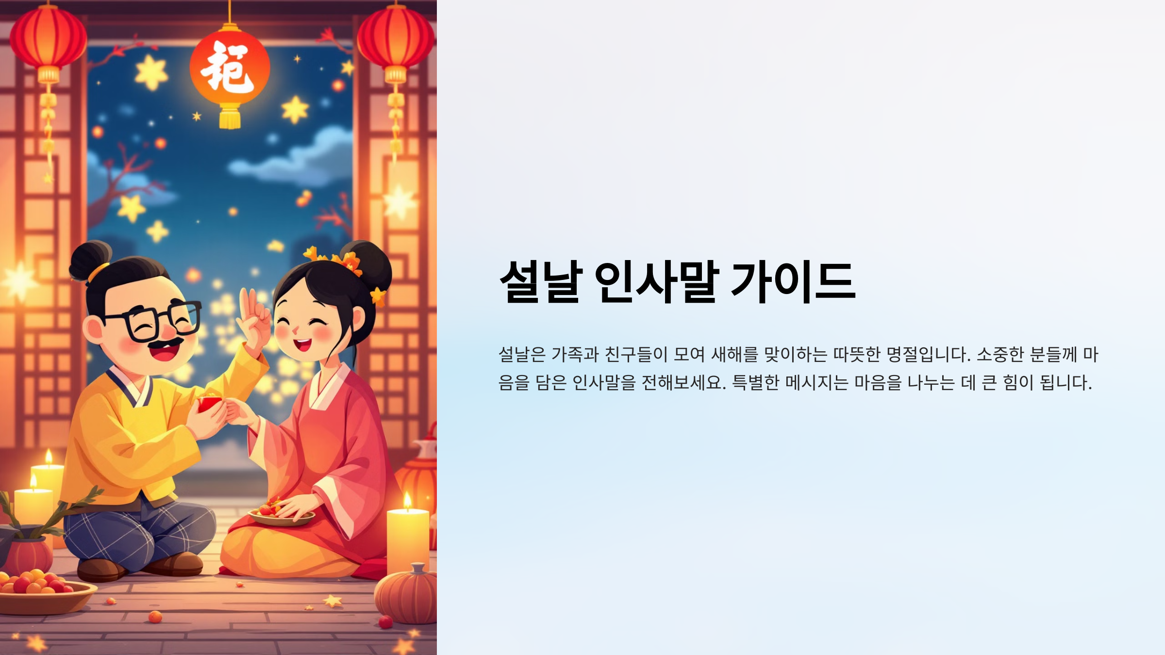 설날은 가족과 친구들이 모여 서로의 건강과 행복을 기원하며 새해를 맞이하는 따뜻한 명절입니다. 이번 설날에는 소중한 분들께 마음을 담은 인사말을 전해보세요. 특별한 메시지는 마음을 나누는 데 큰 힘이 됩니다. 아래 다양한 설날 인사말 예시를 참고하여 여러분의 사랑을 전해보세요.