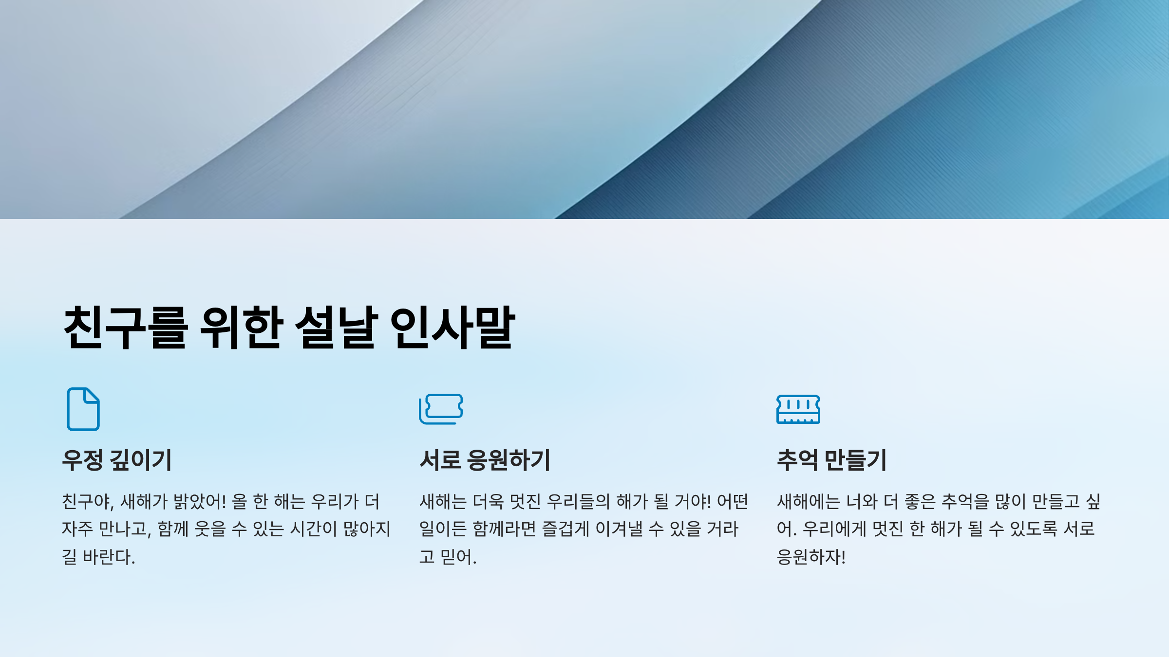 "친구야, 새해에는 네가 바라는 모든 일이 이루어지고 행복한 날들이 가득하길 바란다. 언제나 응원해!"