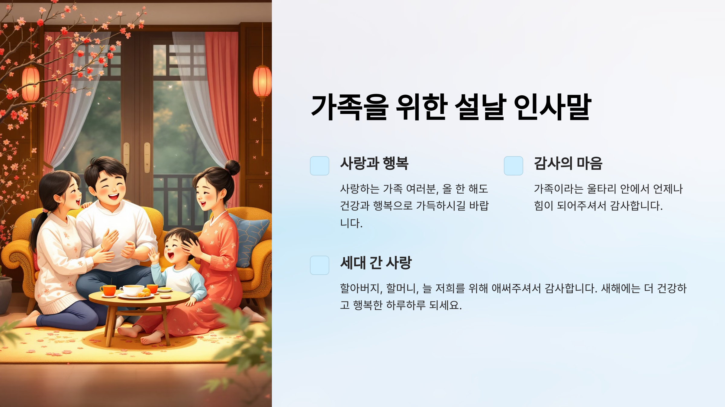 "우리 가족 모두 새해에도 늘 행복하고, 건강이 함께하길 바랍니다. 설날의 기쁨처럼 매일매일 따뜻한 하루가 되길 기원합니다."