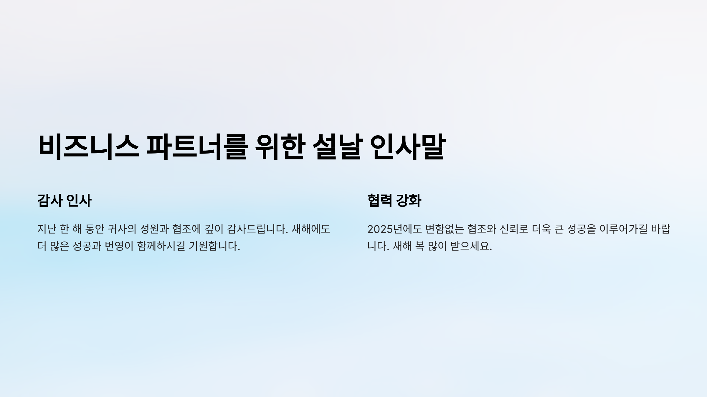 "새해에는 귀사의 사업이 번창하고 더 큰 성과를 이루시길 기원합니다. 늘 감사한 마음입니다."
