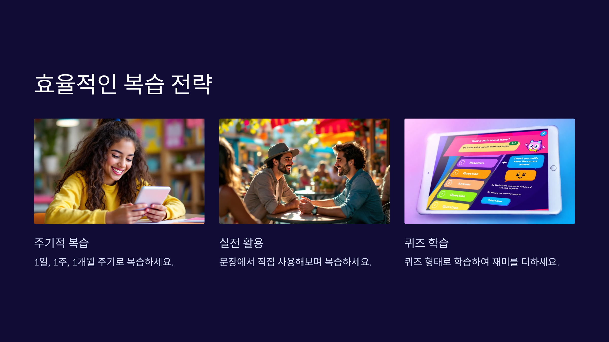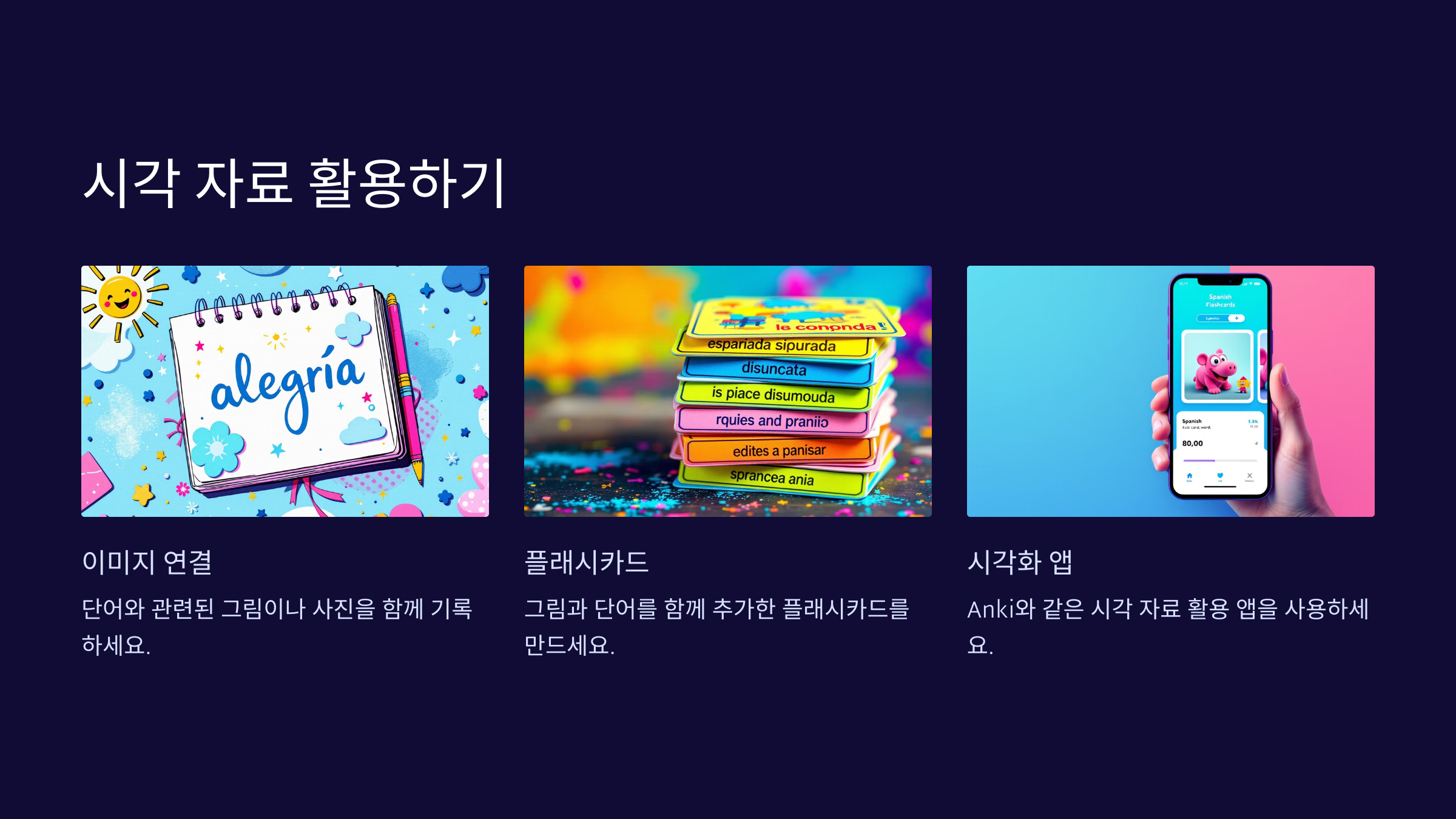 시각 자료를 활용한 앱(예: Anki)을 활용하세요.