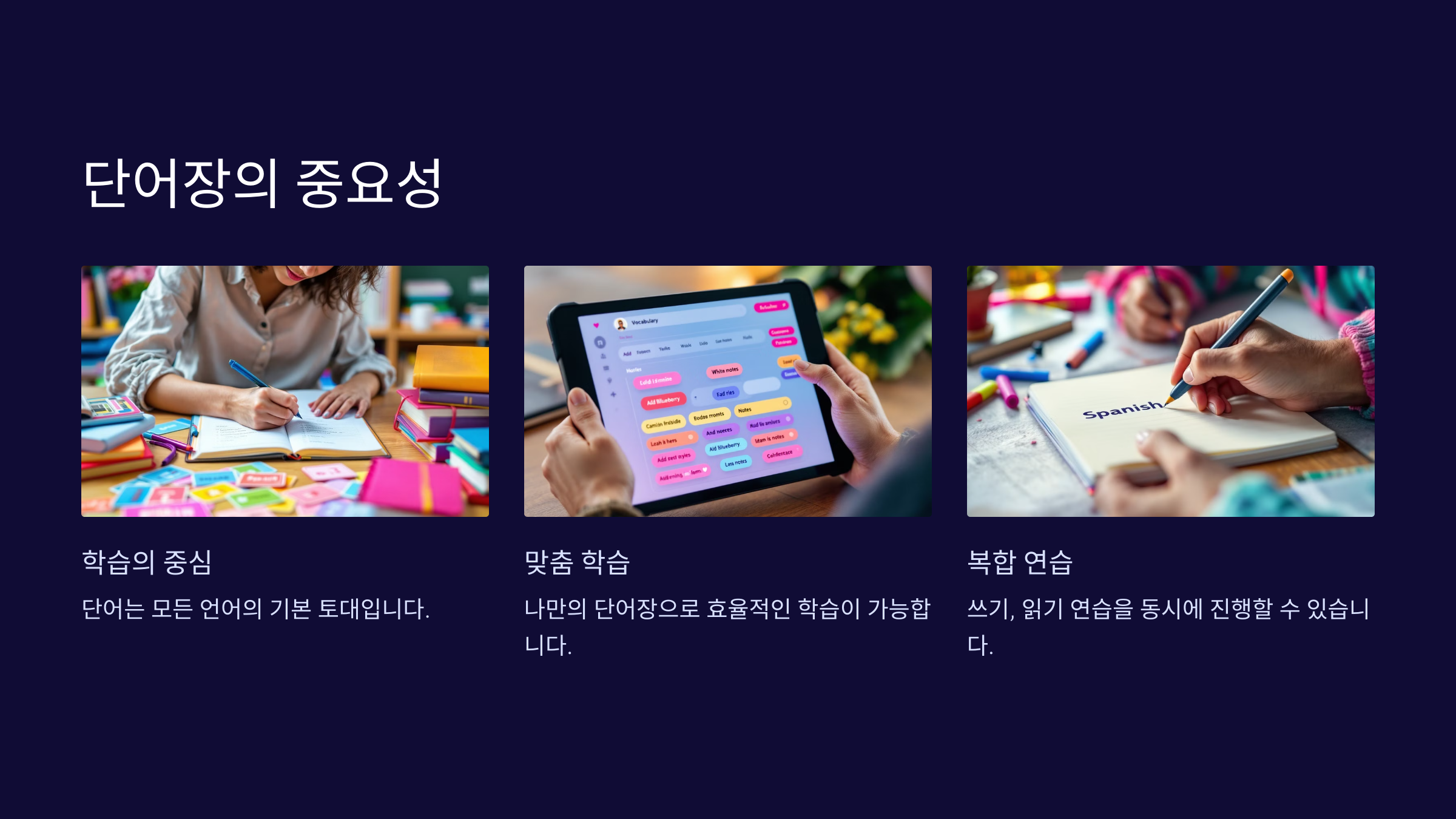 단어장은 학습의 중심입니다. 어휘력은 모든 언어 기술의 기초입니다.