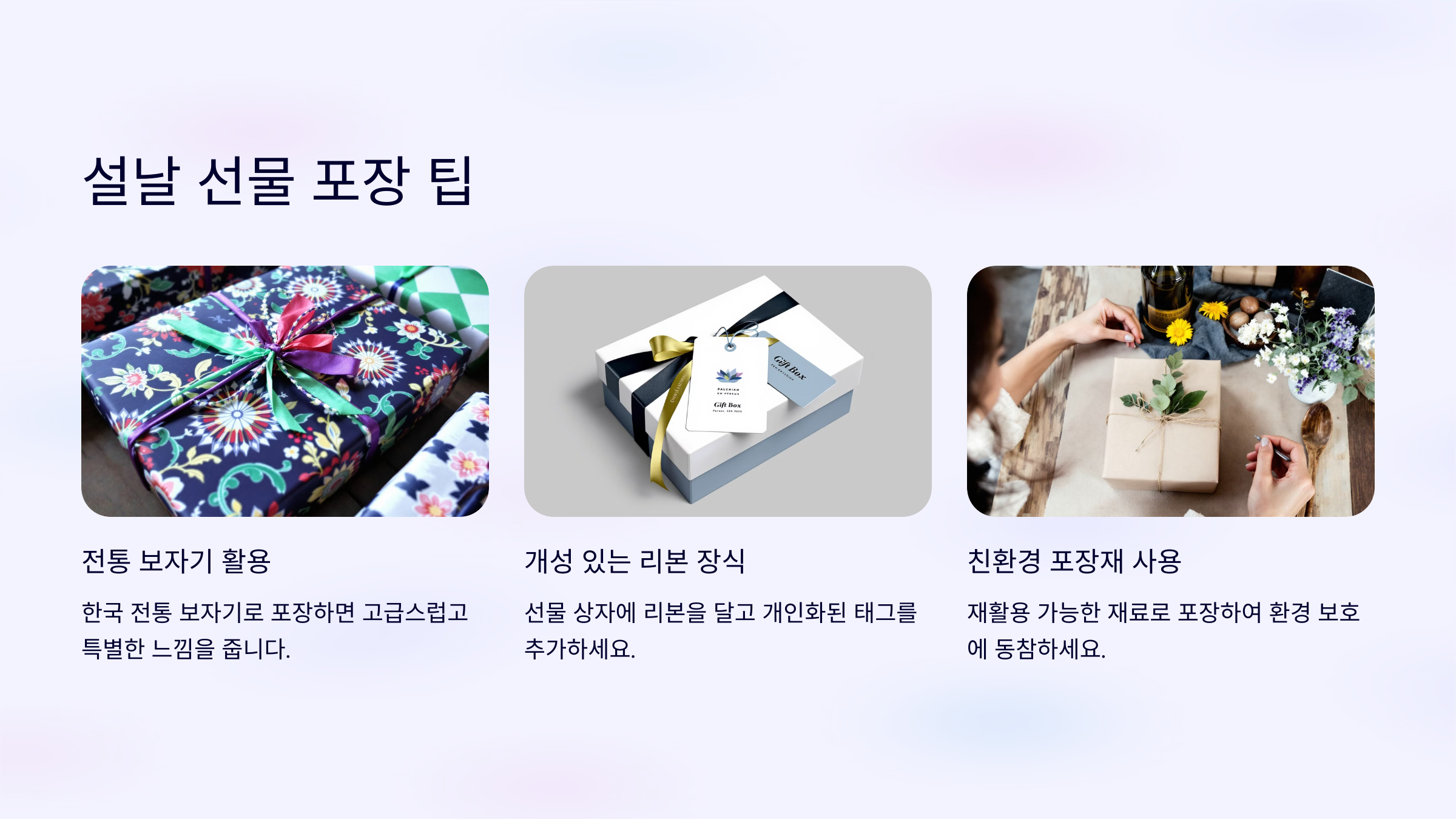 설날은 소중한 사람들에게 감사와 사랑을 표현하기 좋은 시기입니다. 적절한 선물은 마음을 전하는 훌륭한 방법이 될 수 있습니다. 가족, 친구, 동료 등 다양한 관계에 맞는 맞춤형 선물을 추천해드립니다. 아래의 리스트를 참고하여 설날을 더욱 따뜻하고 특별하게 만들어 보세요.