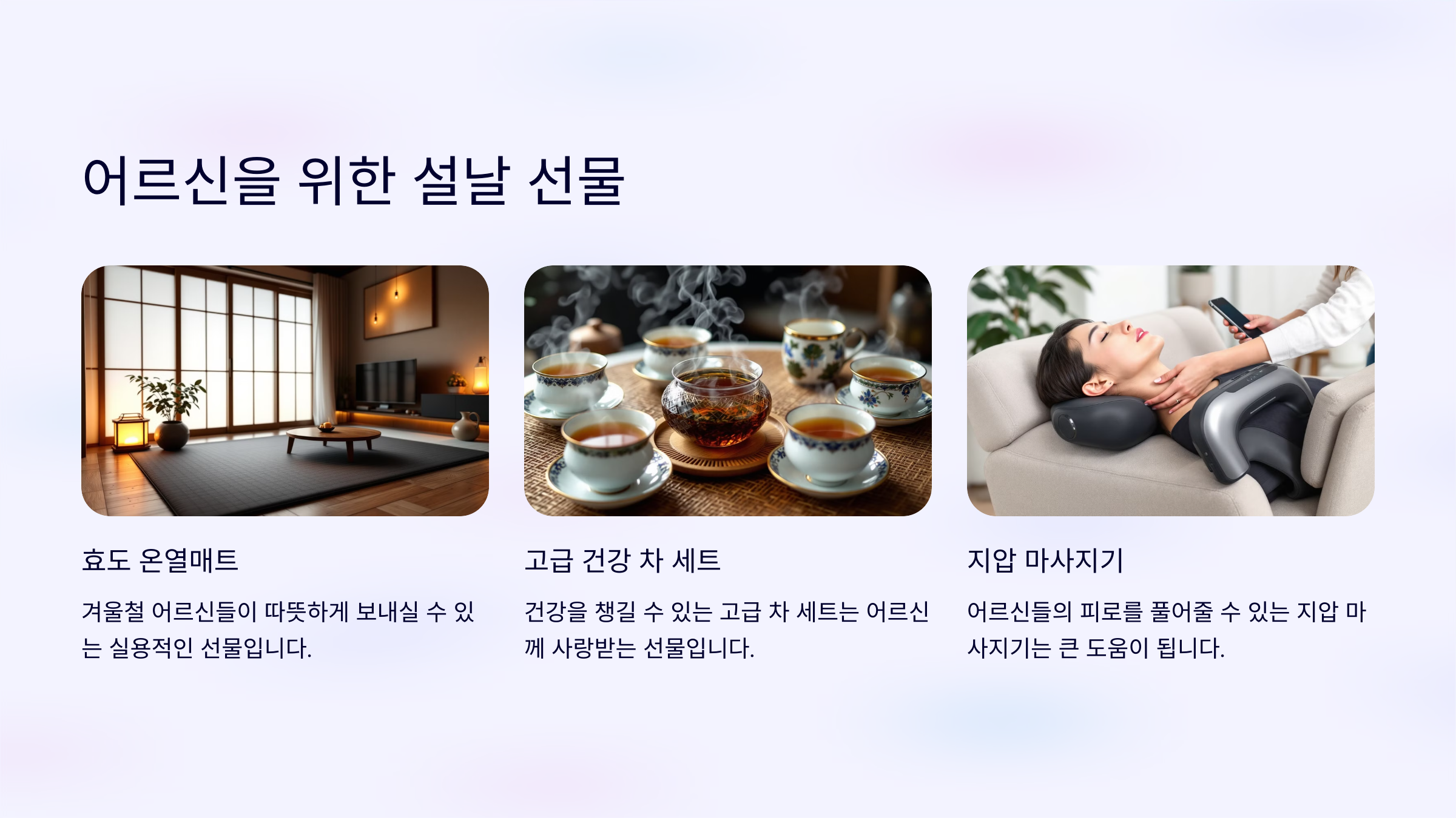 어르신께는 효도 온열매트, 건강 차 세트, 지압 마사지기, 건강즙 세트 같은 건강과 편안함을 고려한 선물이 좋습니다.