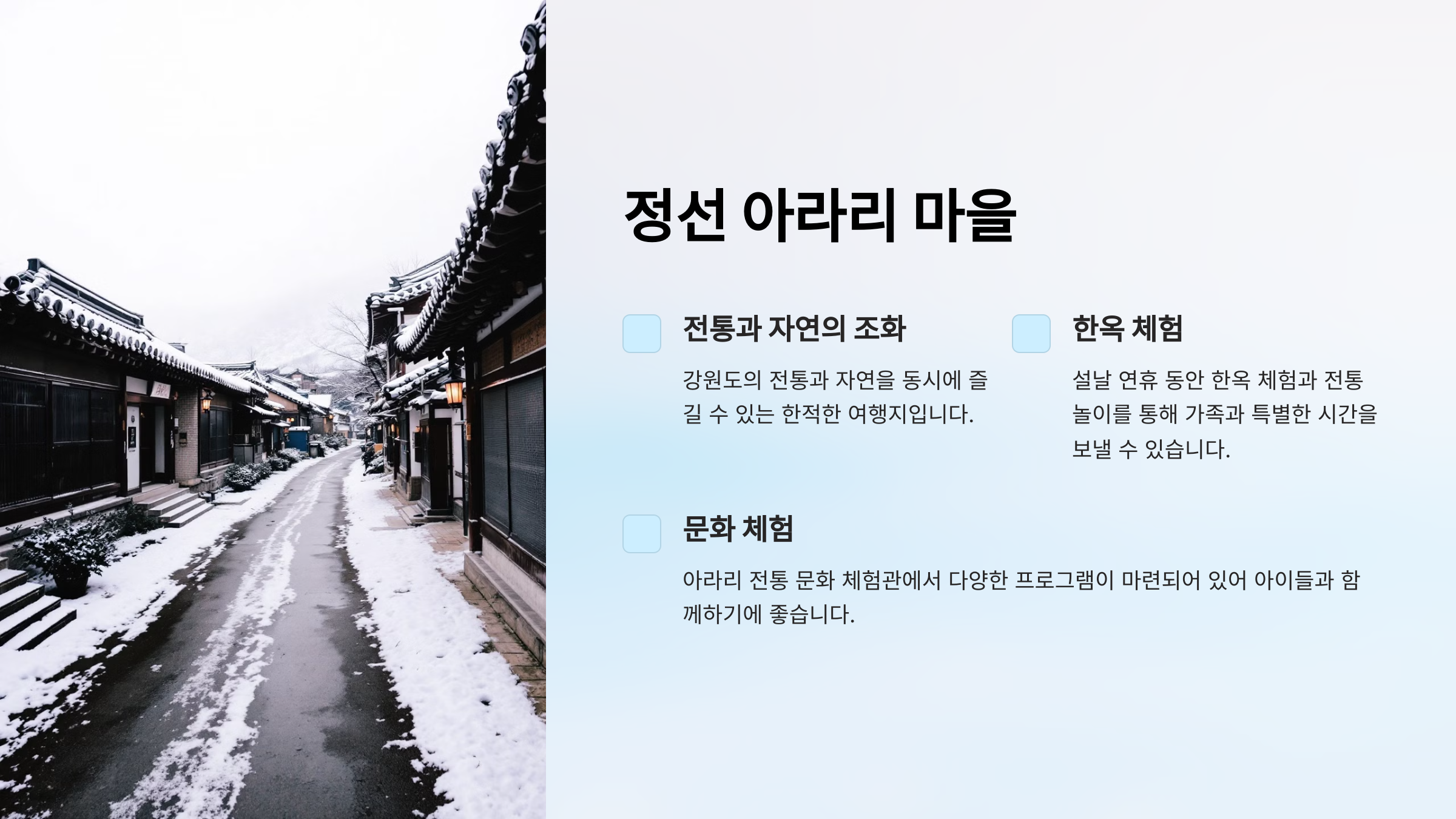 "정선 아라리 마을은 강원도의 전통과 자연을 동시에 즐길 수 있는 한적한 여행지입니다."