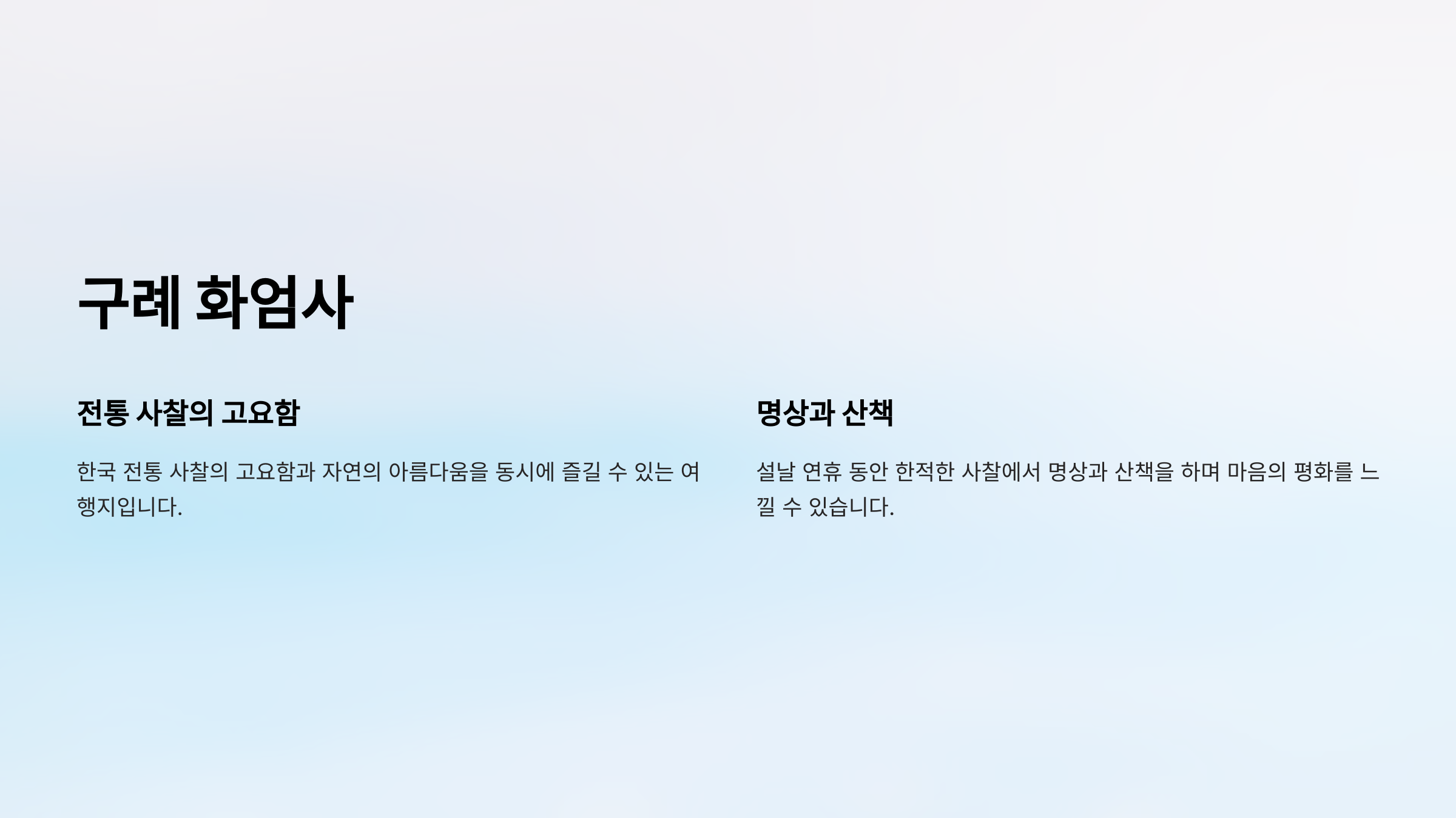 "구례 화엄사는 한국 전통 사찰의 고요함과 자연의 아름다움을 동시에 즐길 수 있는 여행지입니다."