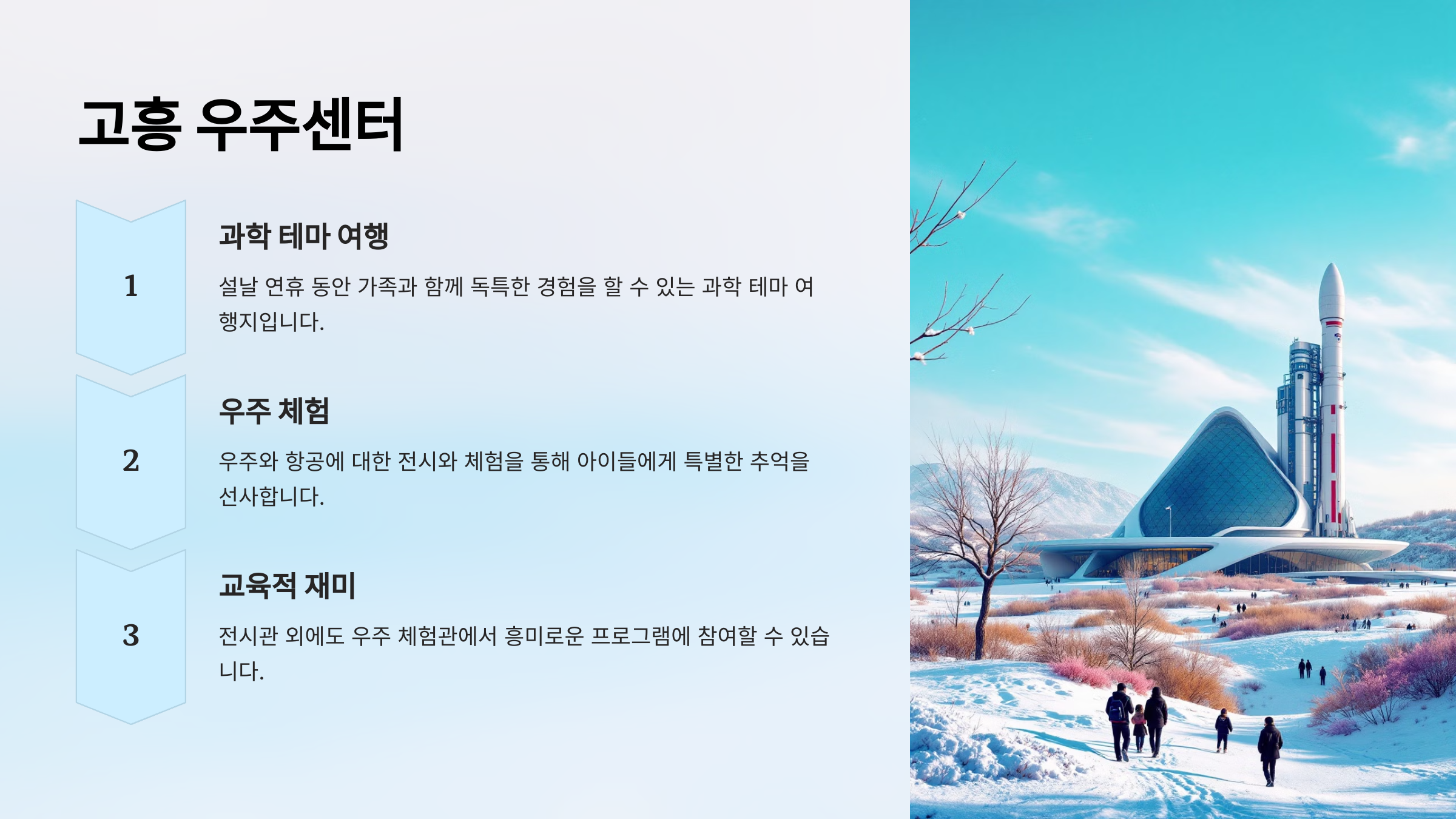 "고흥 우주센터는 설날 연휴 동안 가족과 함께 독특한 경험을 할 수 있는 과학 테마 여행지입니다."