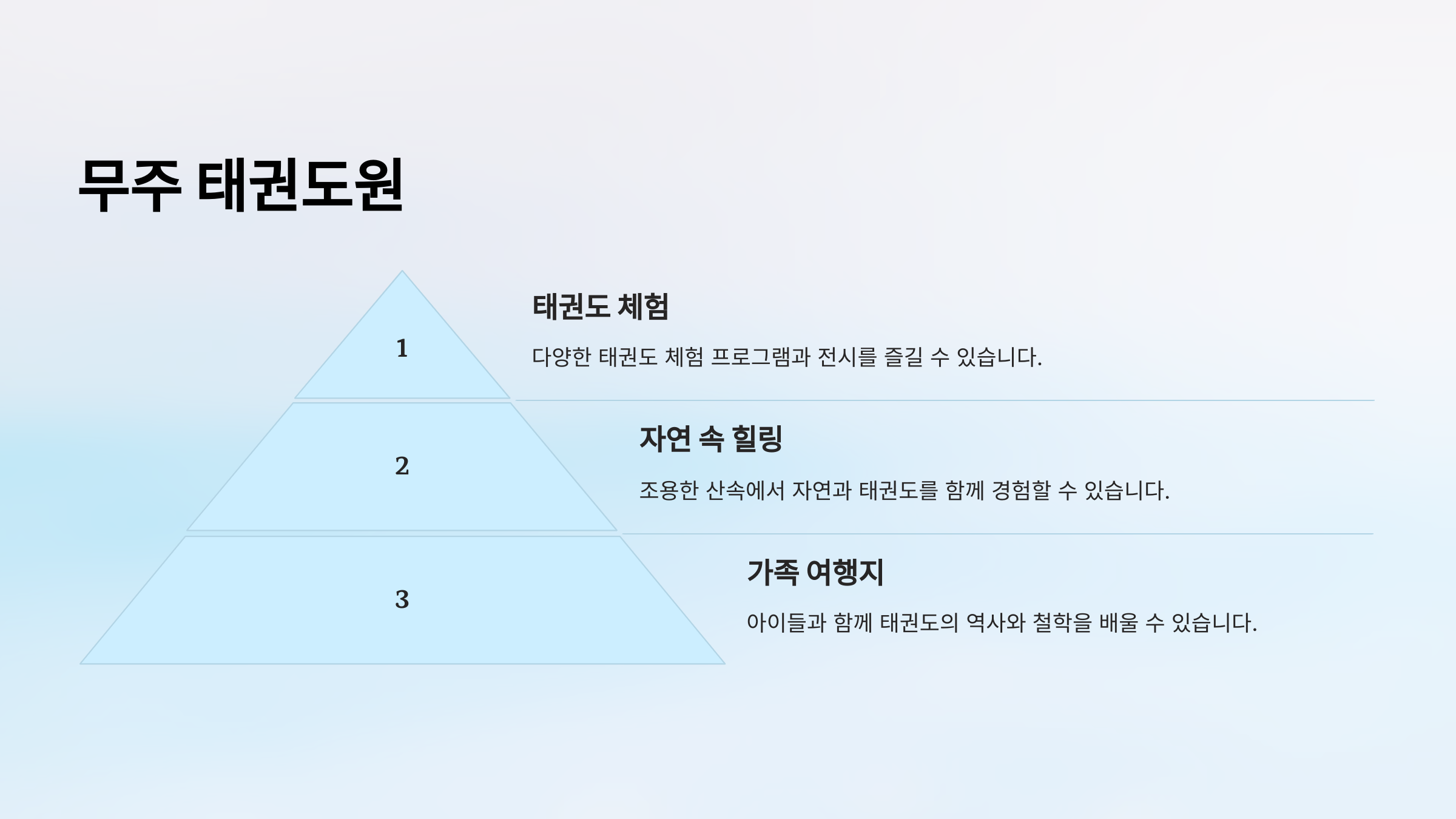 "무주 태권도원은 태권도와 자연이 어우러진 독특한 테마 여행지입니다."