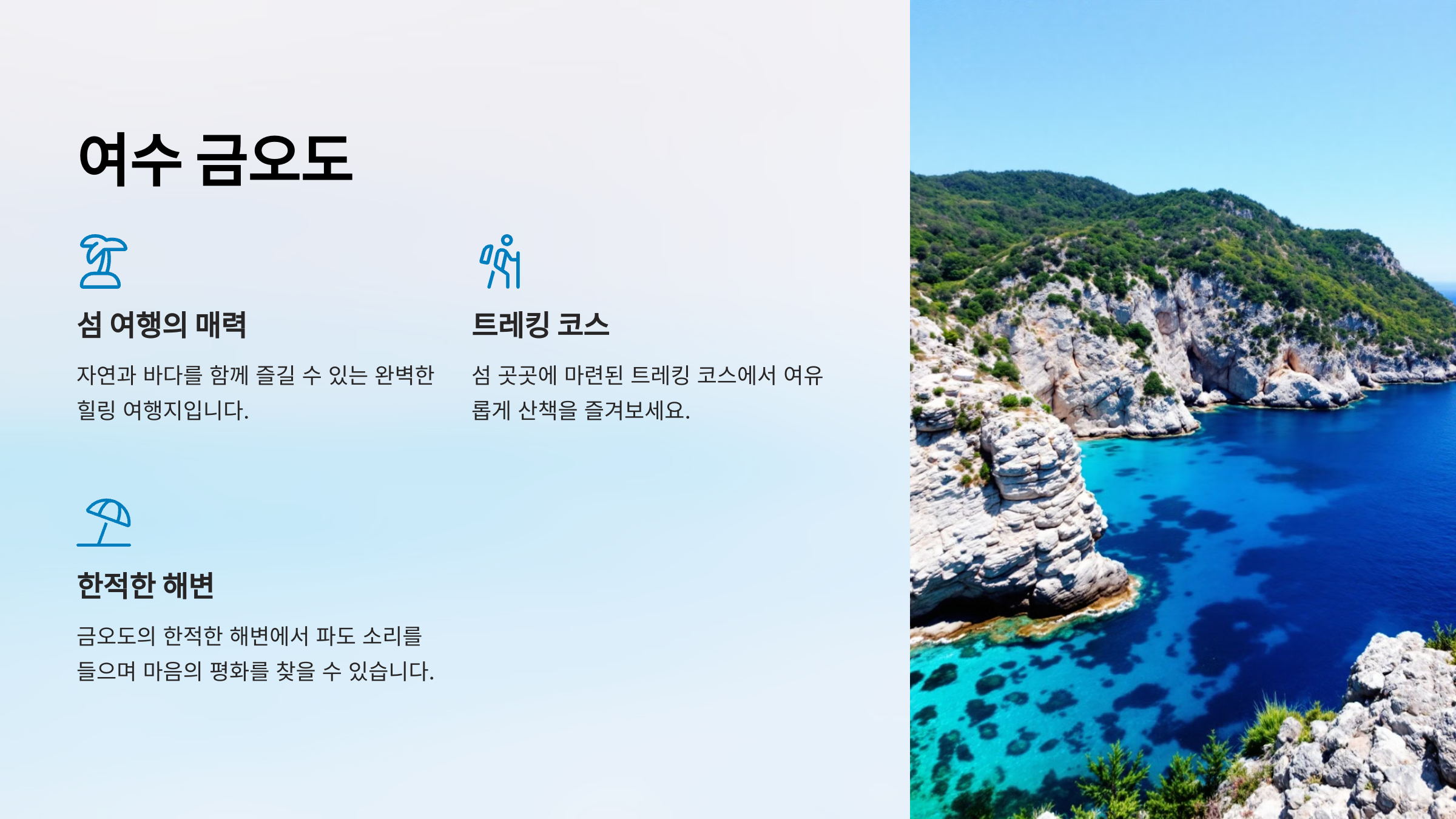 "여수 금오도는 섬 여행의 매력을 그대로 느낄 수 있는 한적하고 아름다운 장소입니다."