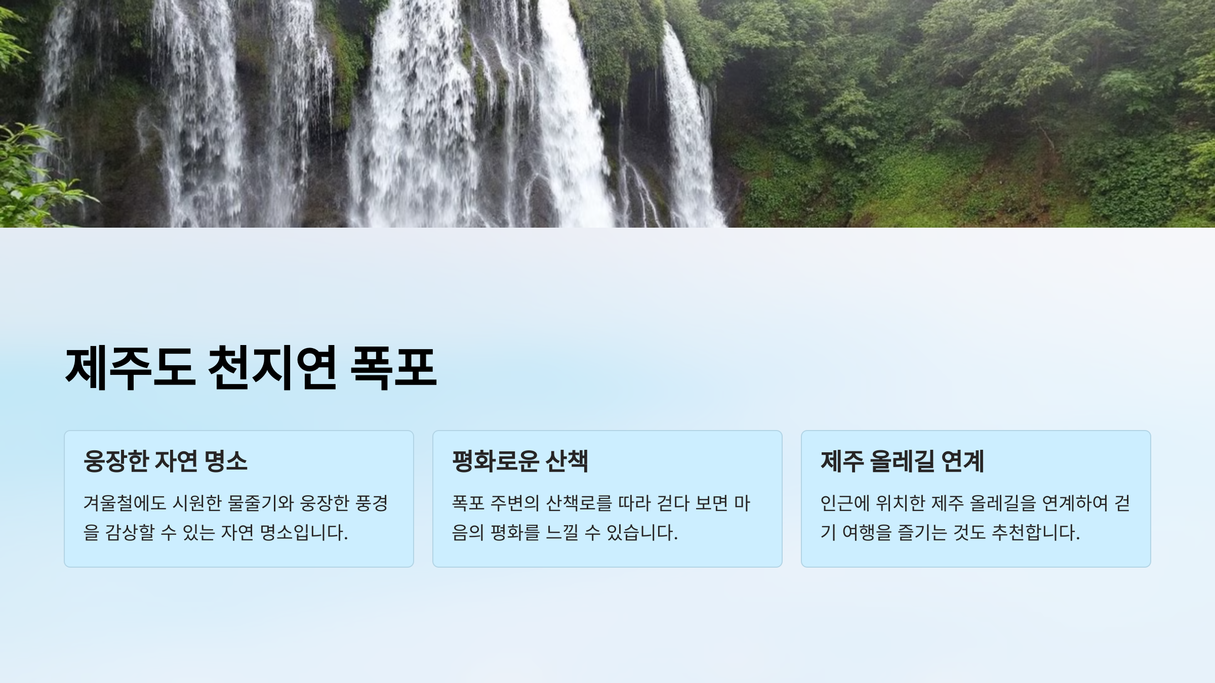 "제주도 천지연 폭포는 겨울철에도 시원한 물줄기와 웅장한 풍경을 감상할 수 있는 자연 명소입니다."