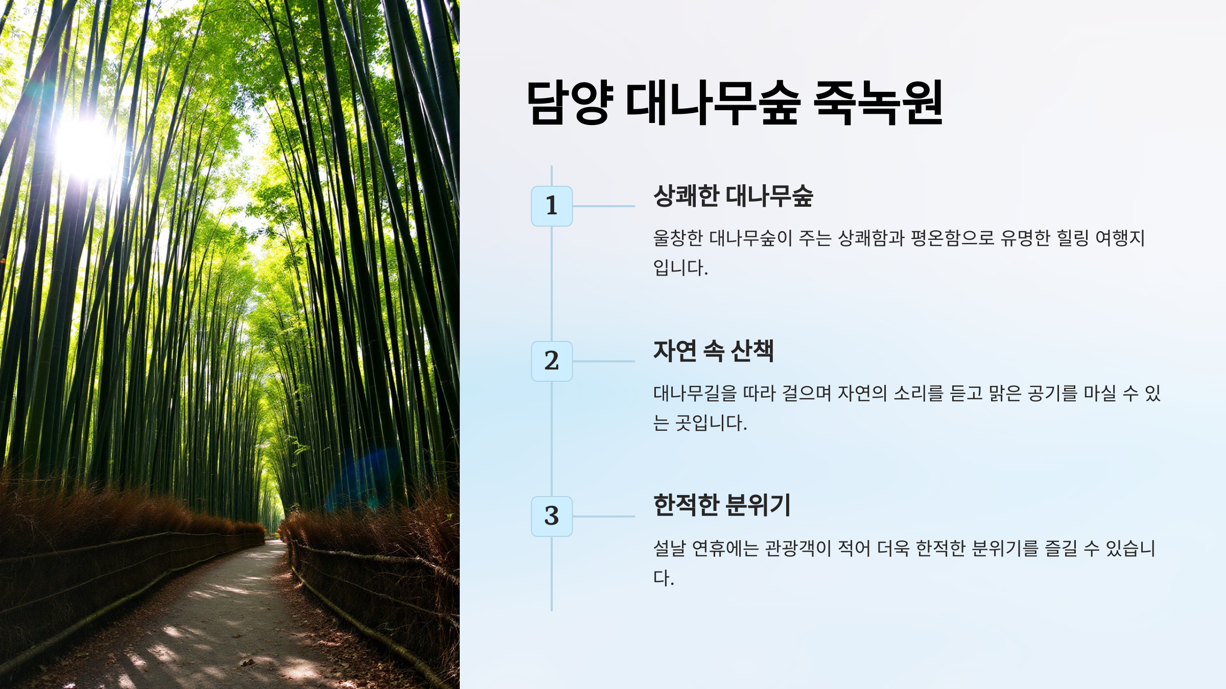 "담양 죽녹원은 울창한 대나무숲이 주는 상쾌함과 평온함으로 유명한 힐링 여행지입니다."