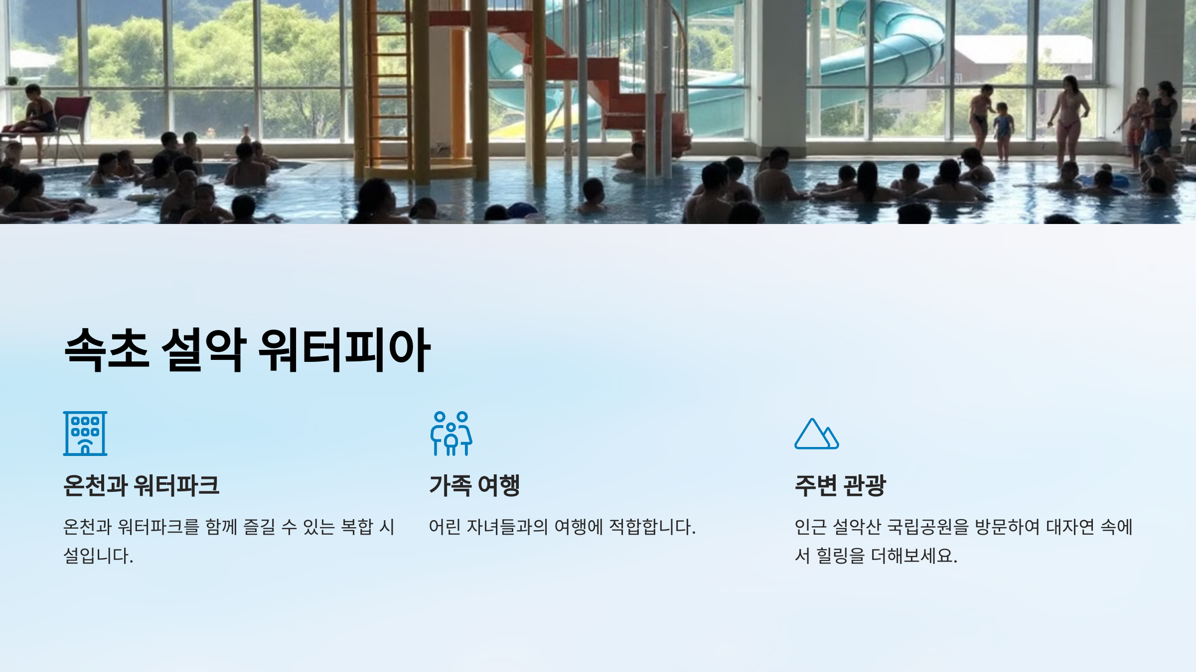 "속초 설악 워터피아는 온천과 워터파크를 함께 즐길 수 있는 복합 시설입니다."