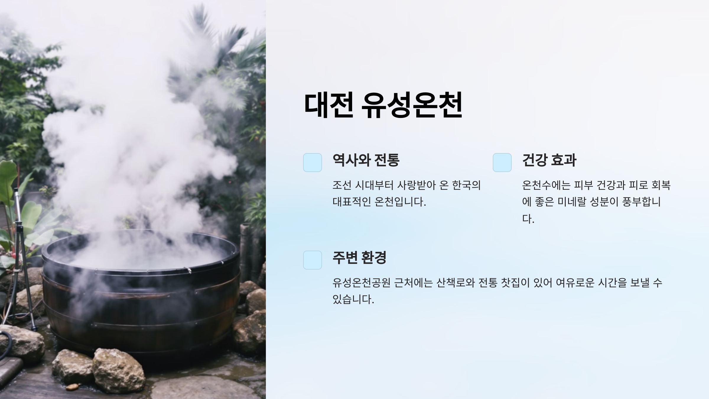 "대전 유성온천은 조선 시대부터 사랑받아 온 한국의 대표적인 온천입니다."