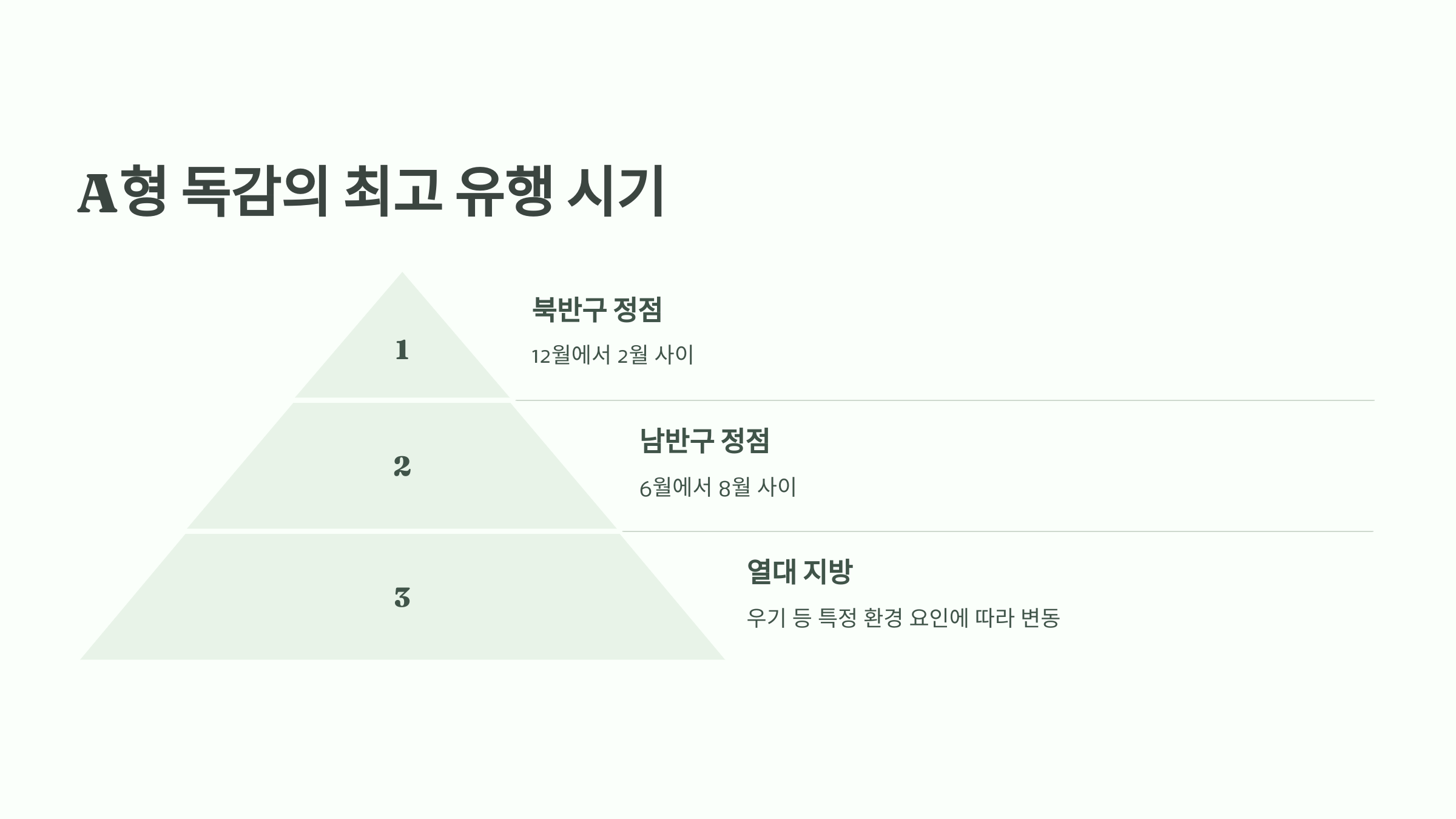 남반구에서는 6월에서 8월 사이가 유행 시기로, 겨울철 환경이 독감 확산에 유리합니다.