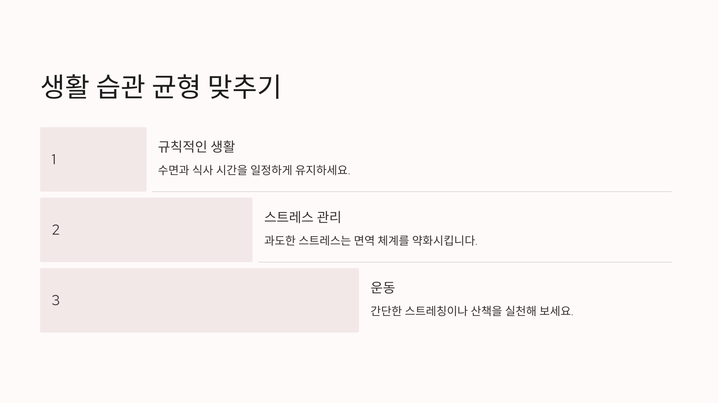 스트레스를 줄이고, 규칙적으로 운동하는 것도 면역력 강화에 효과적입니다.