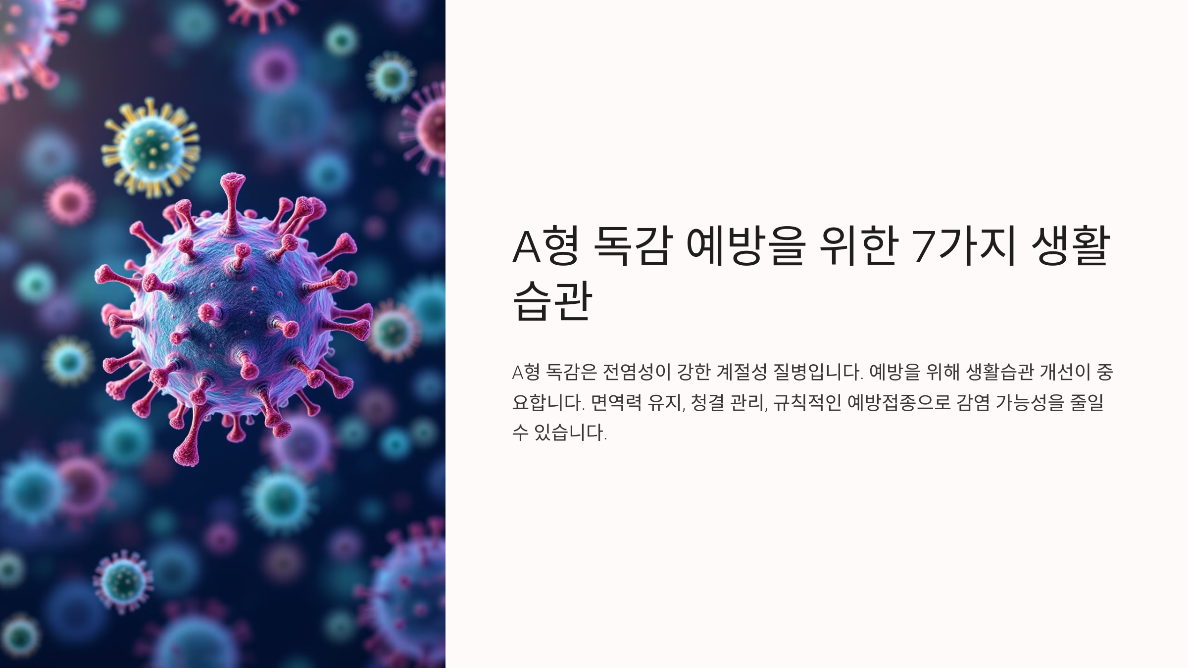 A형 독감은 인플루엔자 바이러스 중 하나로, 전염성이 강하고 계절적으로 유행하는 질병입니다. 이를 예방하기 위해선 평소 생활습관 개선이 매우 중요합니다. 특히 면역력을 유지하고, 청결을 철저히 관리하며, 규칙적인 예방접종을 통해 감염 가능성을 줄일 수 있습니다. 아래에서는 A형 독감을 예방하는 7가지 생활 습관을 자세히 살펴보겠습니다.