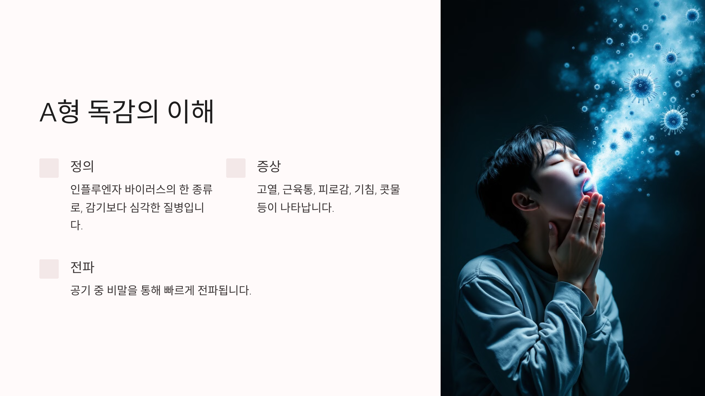A형 독감은 인플루엔자 바이러스의 한 종류로, 감기와 비슷한 증상을 보이지만 훨씬 더 심각한 질병입니다.