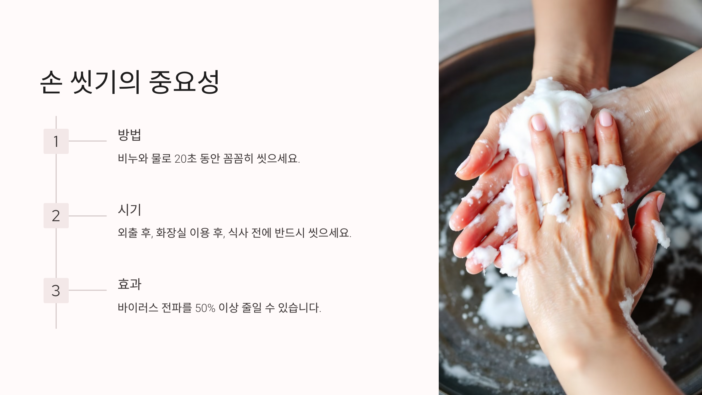 손씻기만으로도 바이러스 전파를 50% 이상 줄일 수 있다는 연구 결과가 있습니다.
